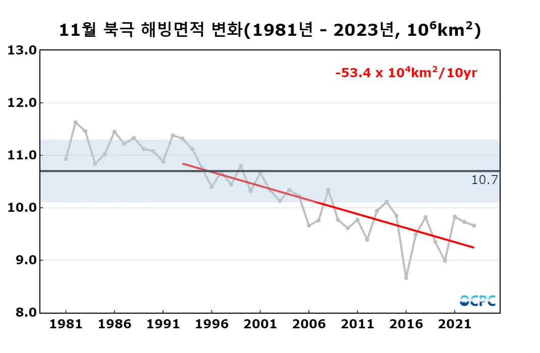 1993~2023년 동안 11월 북극 해빙면적은 10년에 53만km²씩 감소하는 추세입니다.