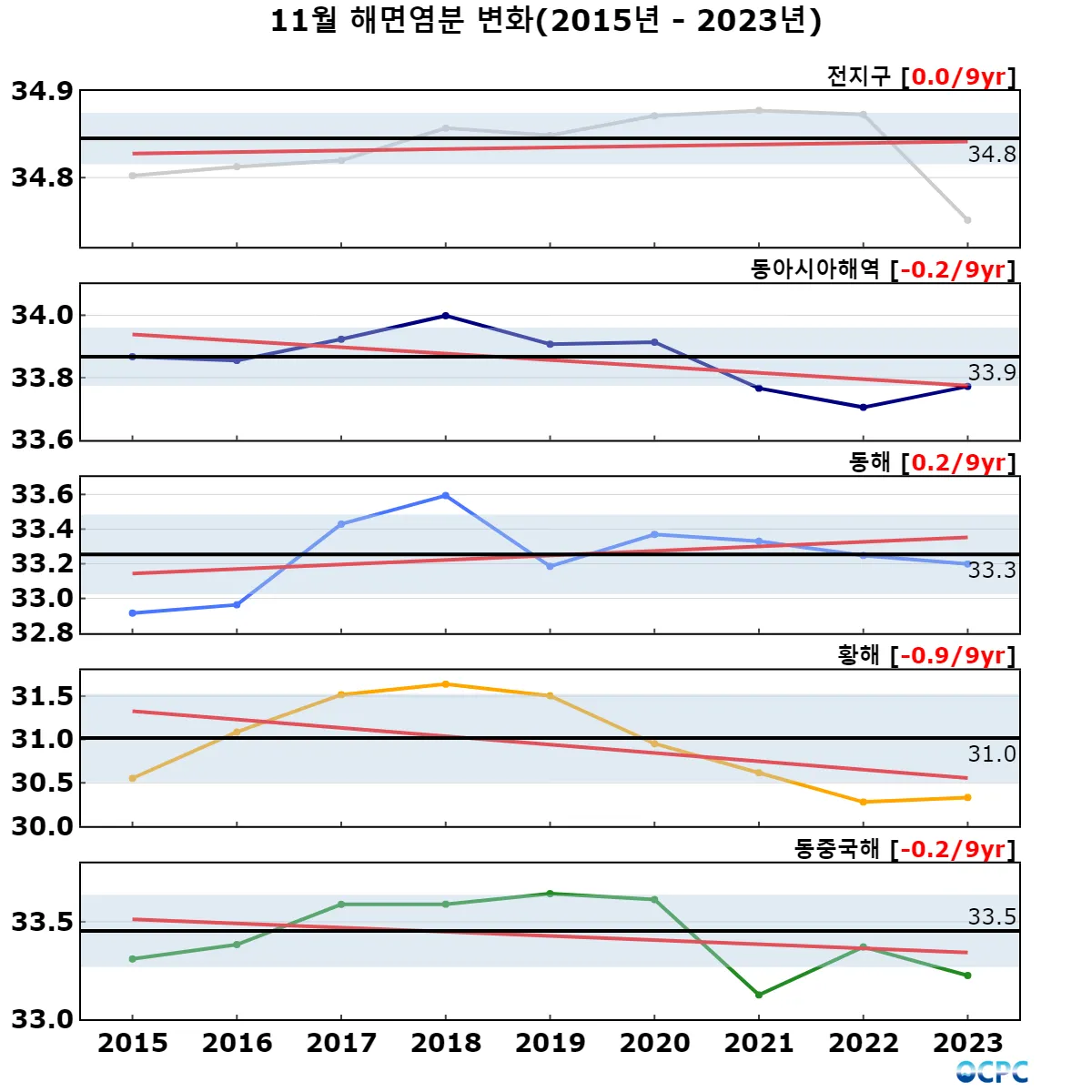 1993~2023년 동안 전지구 11월 해면수온은 10년에 0.2°C씩 증가하는 추세이며, 동아시아해역의 추세는 10년에 0.1~0.5°C로 그 중 동해의 상승률이 가장 큽니다.