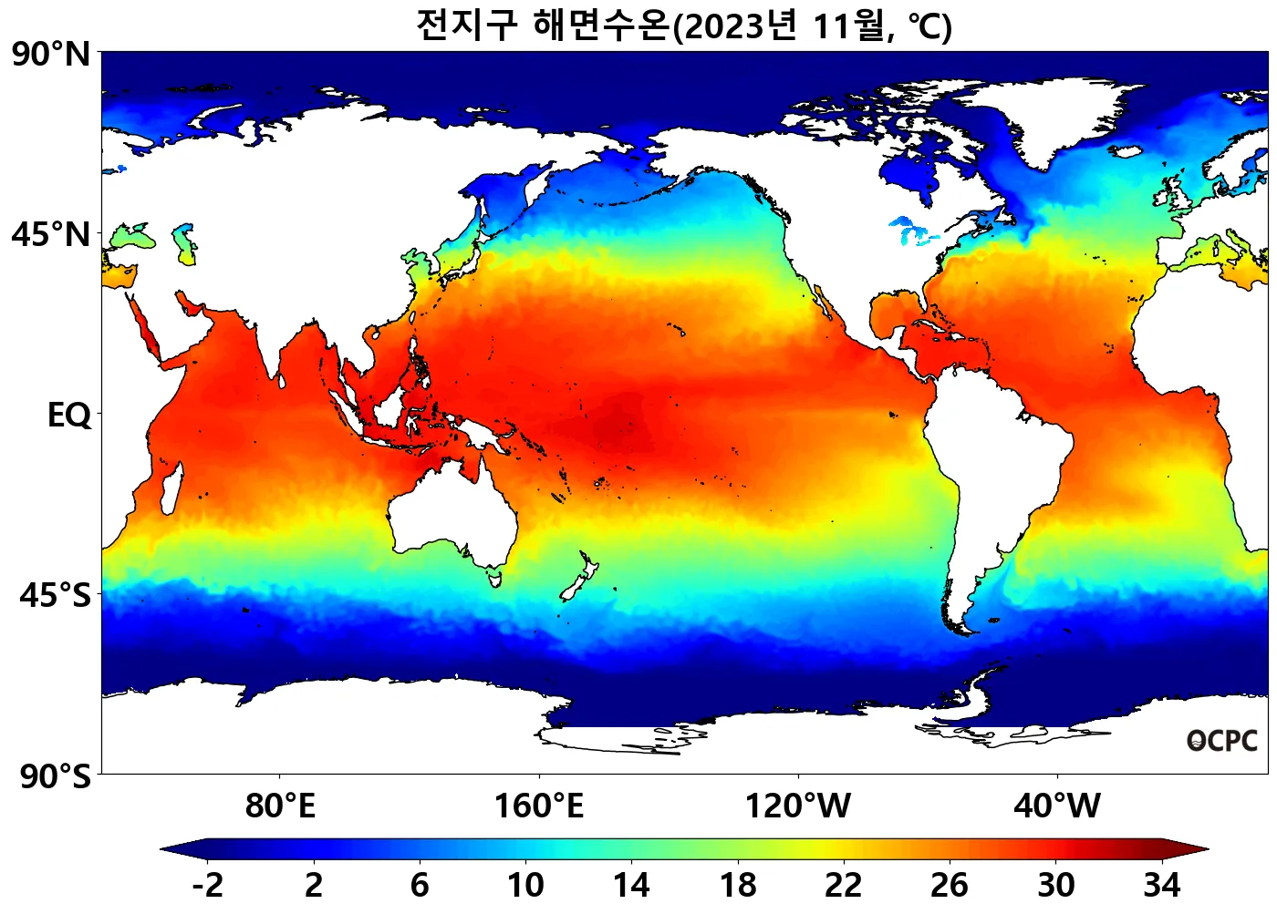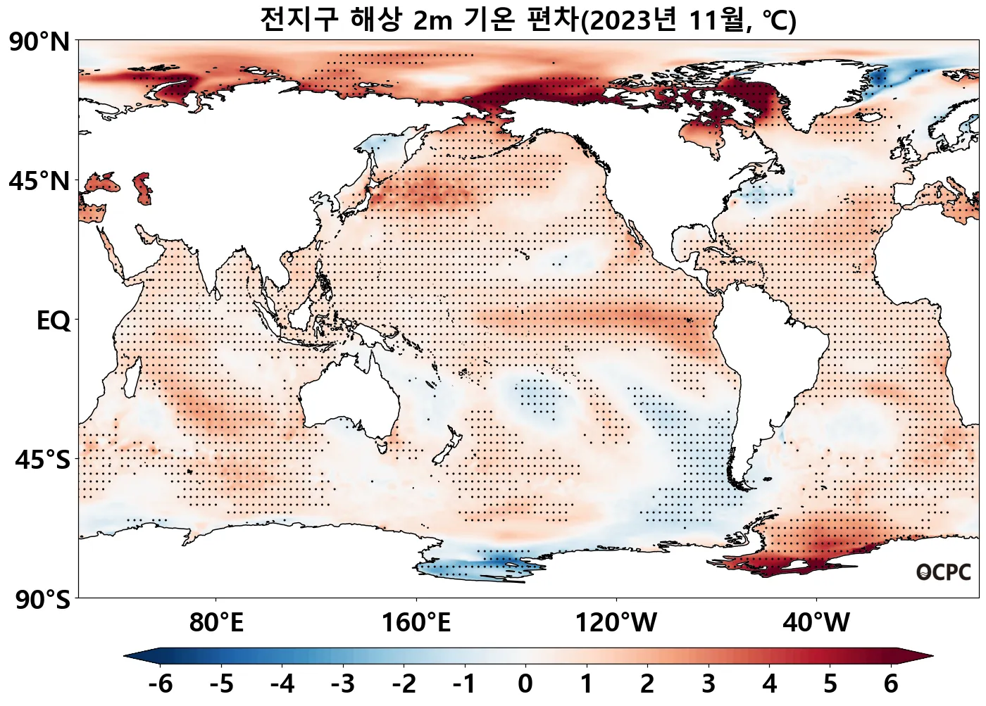 전지구 평균 해면수온은 평년(18.0±0.2°C)보다 0.6°C 높아 1982~2023년(11월) 중 가장 높았습니다. 특히 북태평양 중위도 해역(160°E~160°W, 30~60°N), 열대 동태평양(75~120°W, 0~30°S)에서 양의 해면수온 편차가 크게 나타납니다.