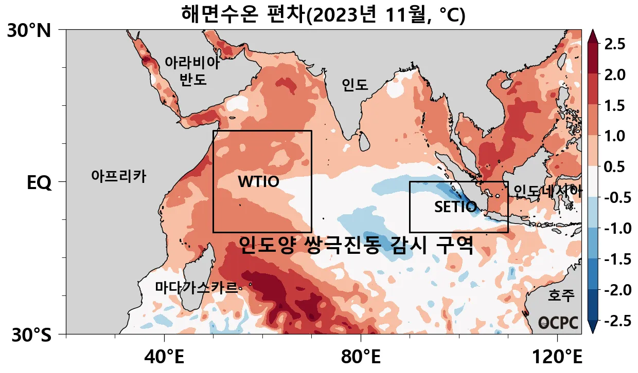 2023년 11월 평균 해면수온의 평년 대비 편차(사각형은 인도양 쌍극진동 감시구역으로 각각 WTIO(열대서인도양), SETIO(열대 남동인도양) 해역이며, 인도양 쌍극진동 지수(DMI: Dipole Mode Index)는 WTIO의 평년 대비 편차에서 SETIO의 평년 대비 편차를 뺀 값입니다.)