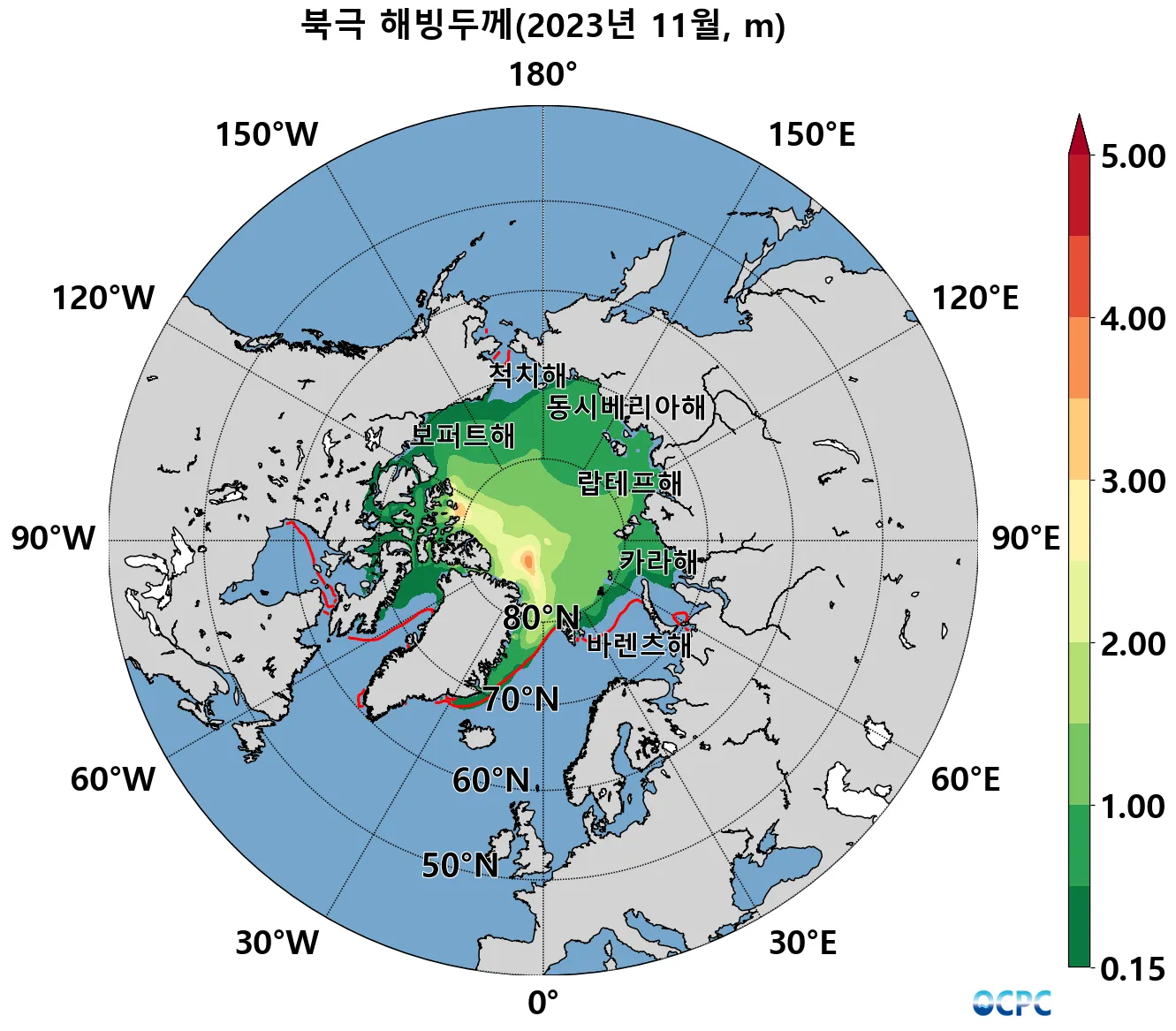 해빙두께 0.15m 이상 해역, 붉은선(평년 해빙두께 0.15m 경계)