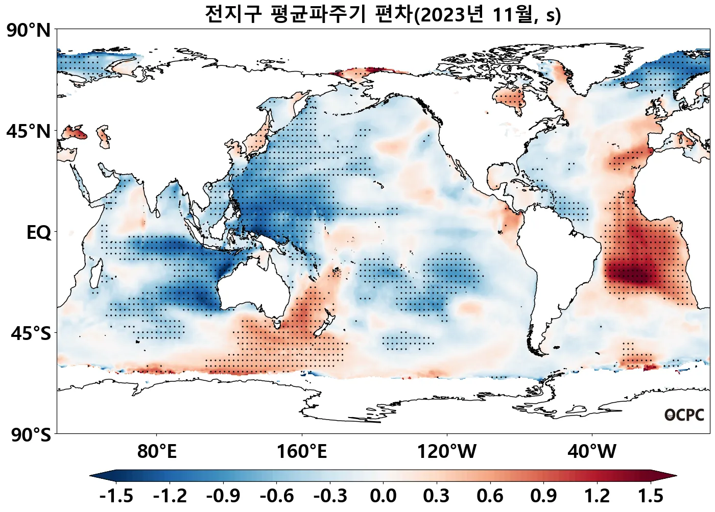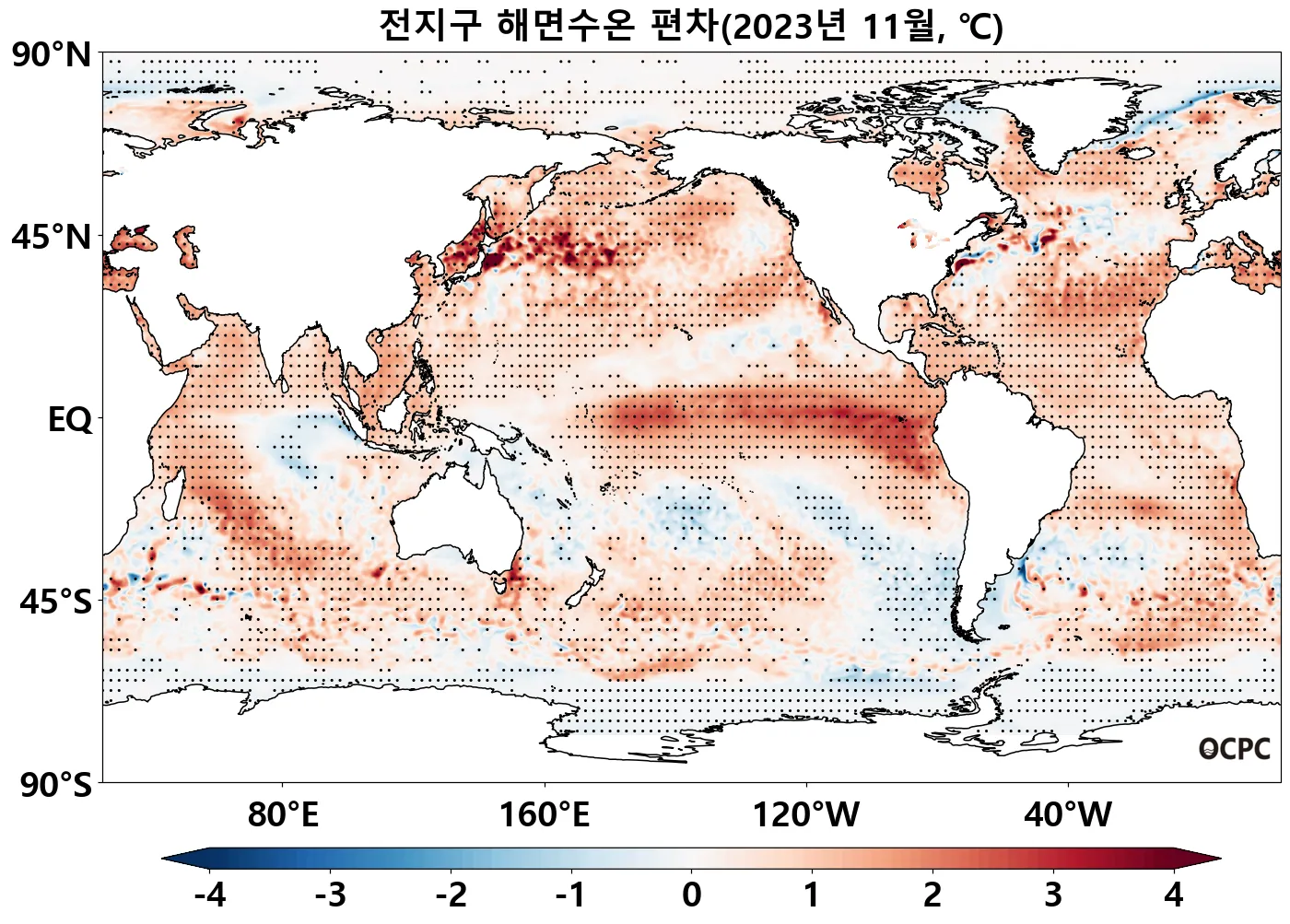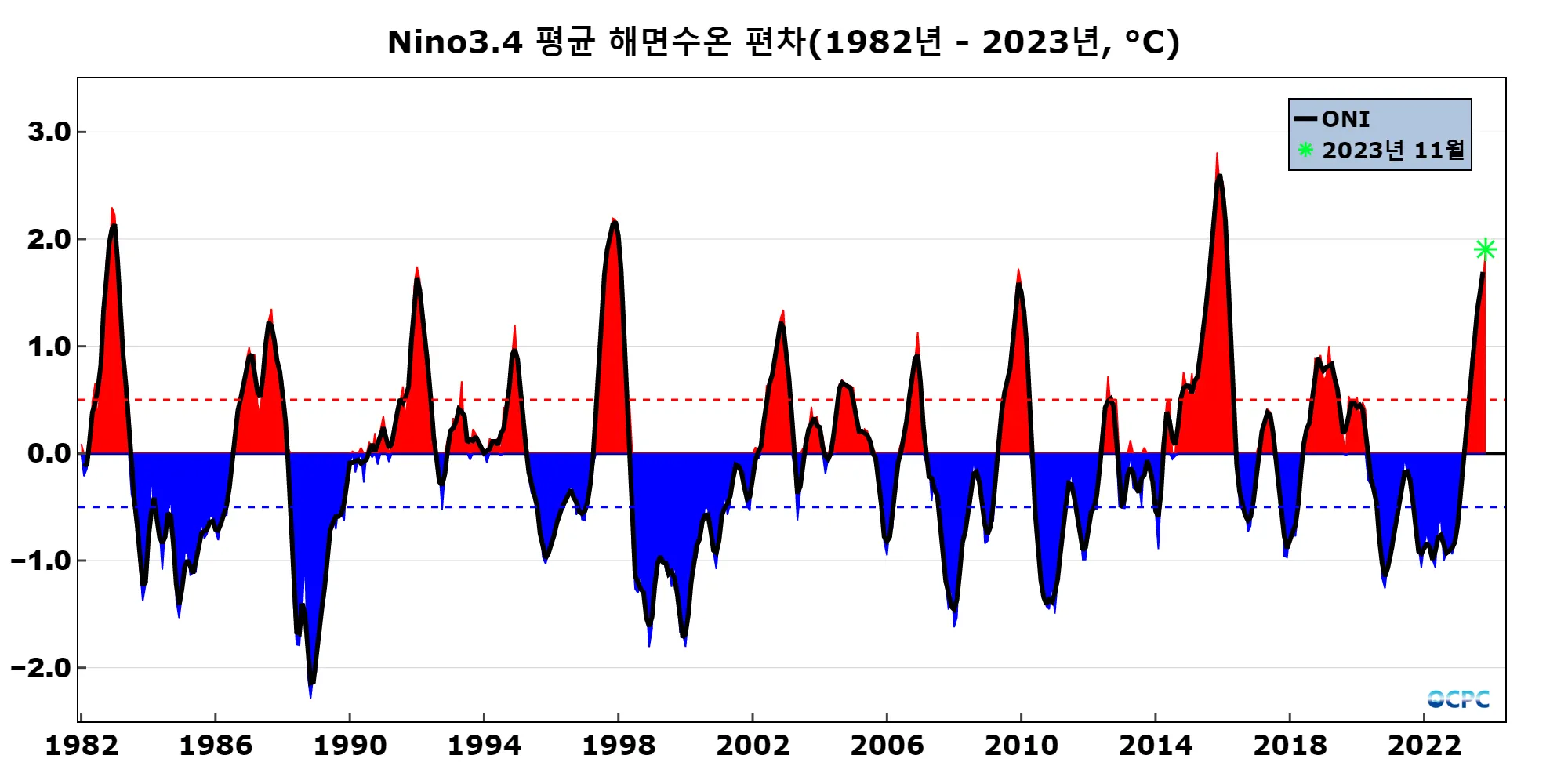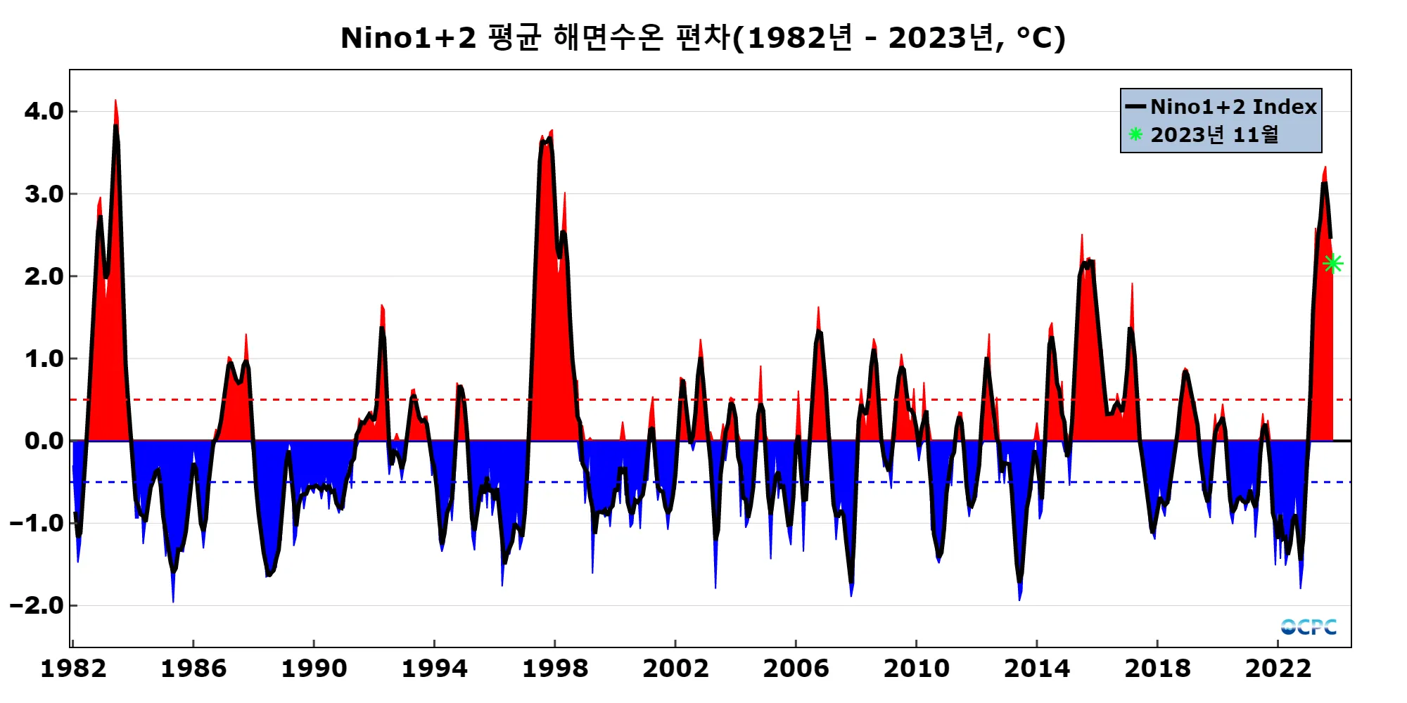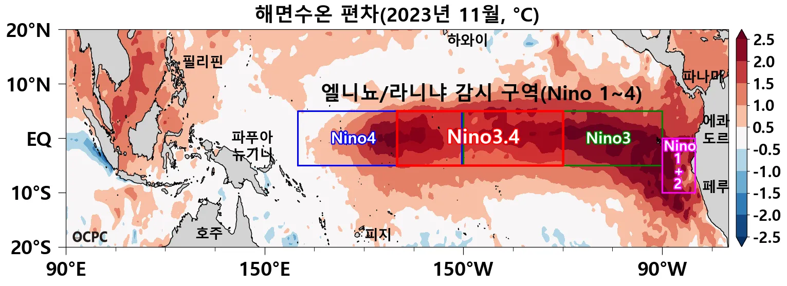 엘니뇨/라니냐 감시구역인 열대 태평양 Nino3.4 해역(5°S~5°N, 170°W~120°W)의 11월 평균 해면수온 편차는 1.9°C, Nino1+2해역(10°S~0°, 90°W~80°W)은 2.2°C로 엘니뇨가 강하게 발달하고 있습니다.
