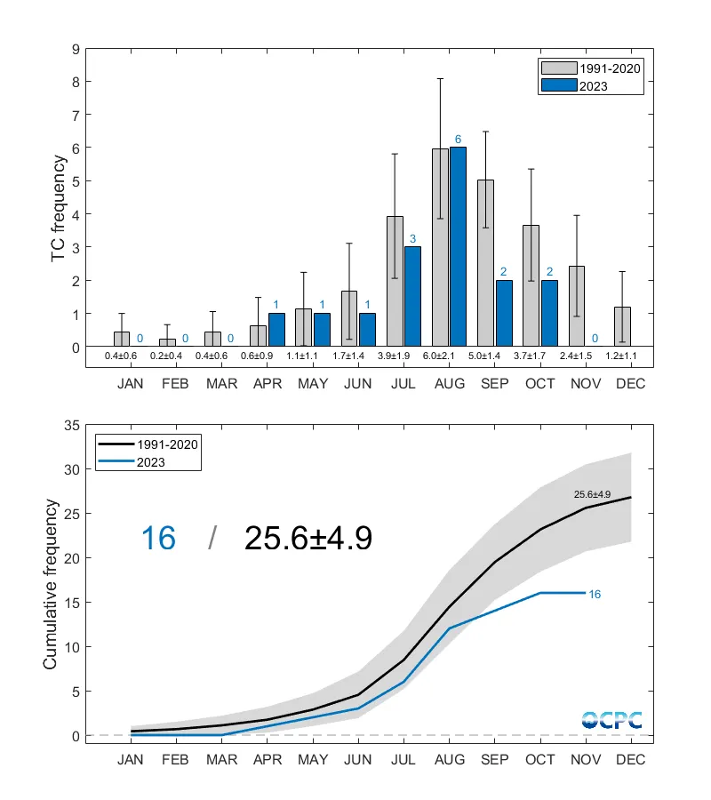 누적 발생수는 총 16개로 평년(약 21~31개)보다 적습니다.