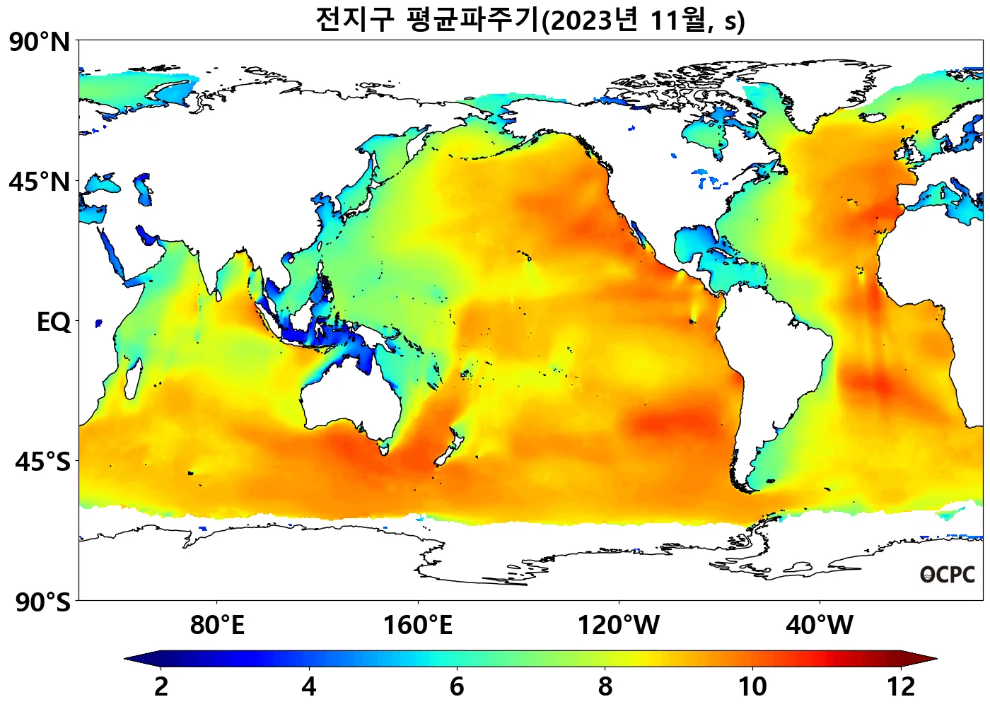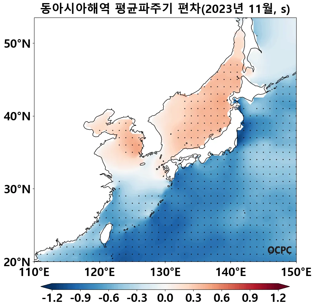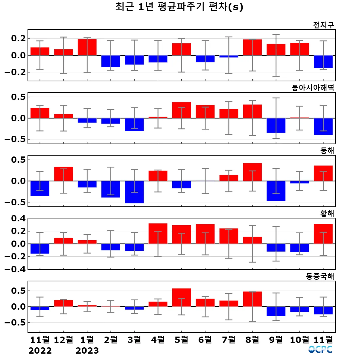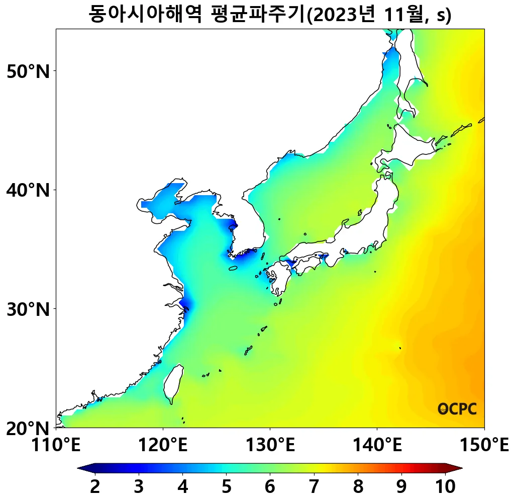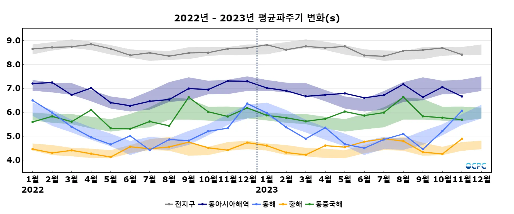 동해, 황해의 평균파주기는 평년(5.7±0.2초, 4.6±0.2초)보다 각각 0.4초, 032초씩 증가했으며, 동중국해는 평년(5.9±0.3초)과 비슷했습니다.
