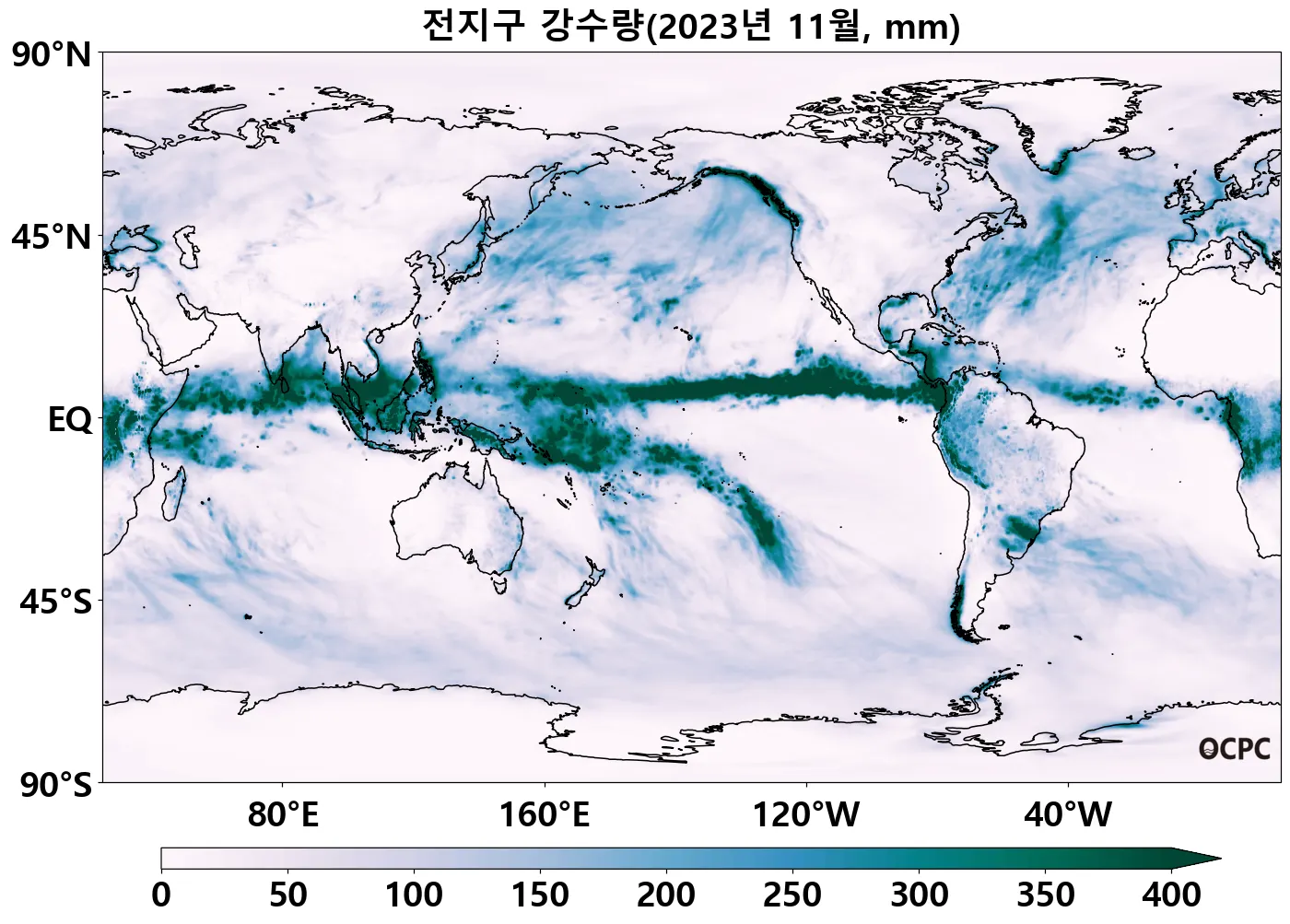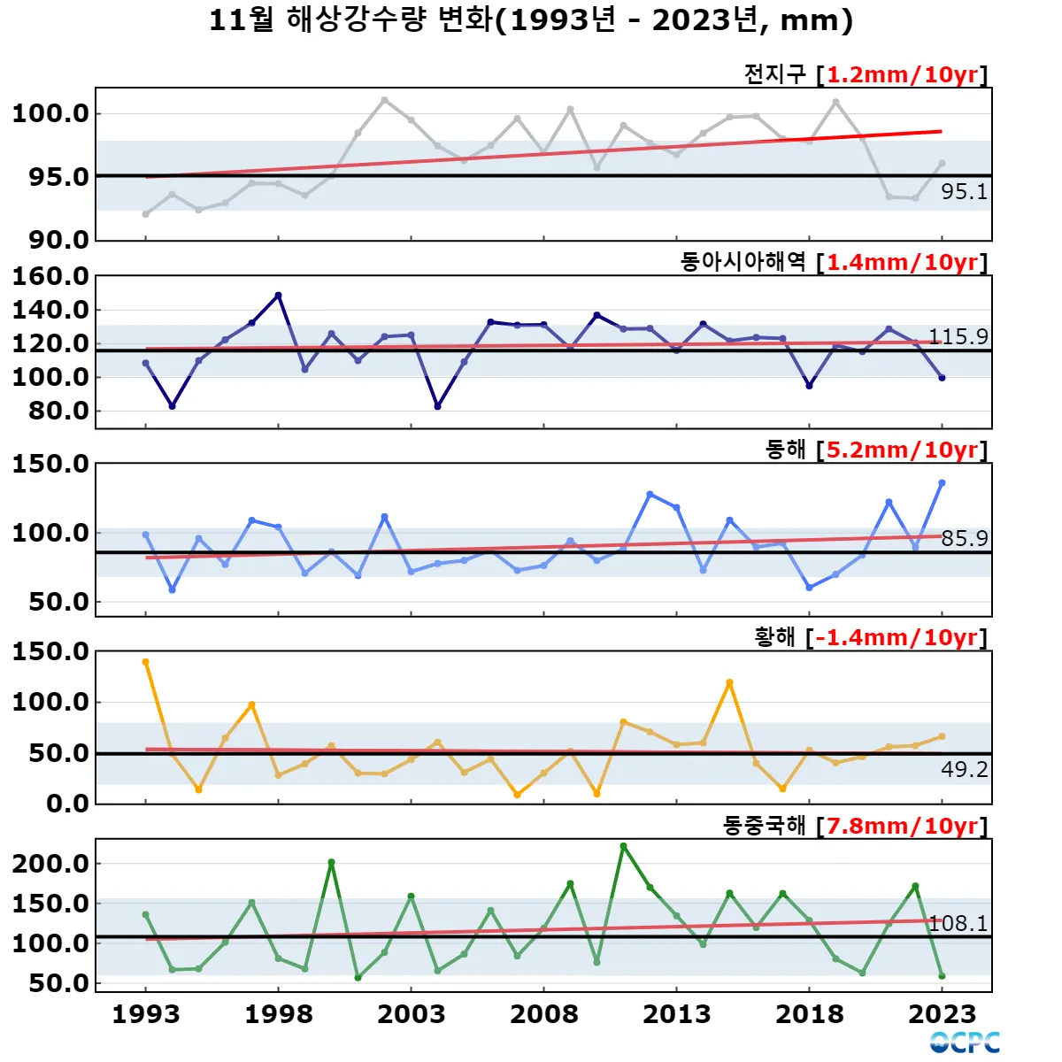 1993~2023년 동안 전지구 11월 해상강수량은 10년에 1.2mm, 동아시아해역은 10년에 1.4mm 증가하는 추세입니다.