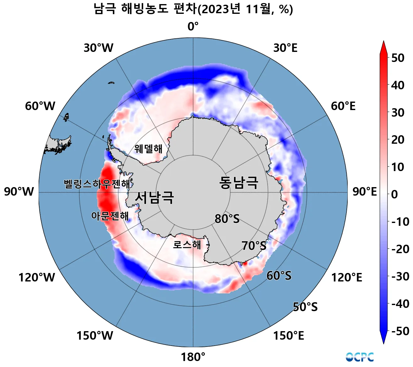 11월초 해빙면적 감소의 둔화가 보고되었으나 중후반 급격한 해빙의 감소가 나타나며 아문젠해와 벨링스하우젠해를 제외한 대부분의 해역에서 평년 대비 해빙면적이 감소했으며, 2016년 이후 11월 기준 2번째로 적은 해빙면적을 기록했습니다.