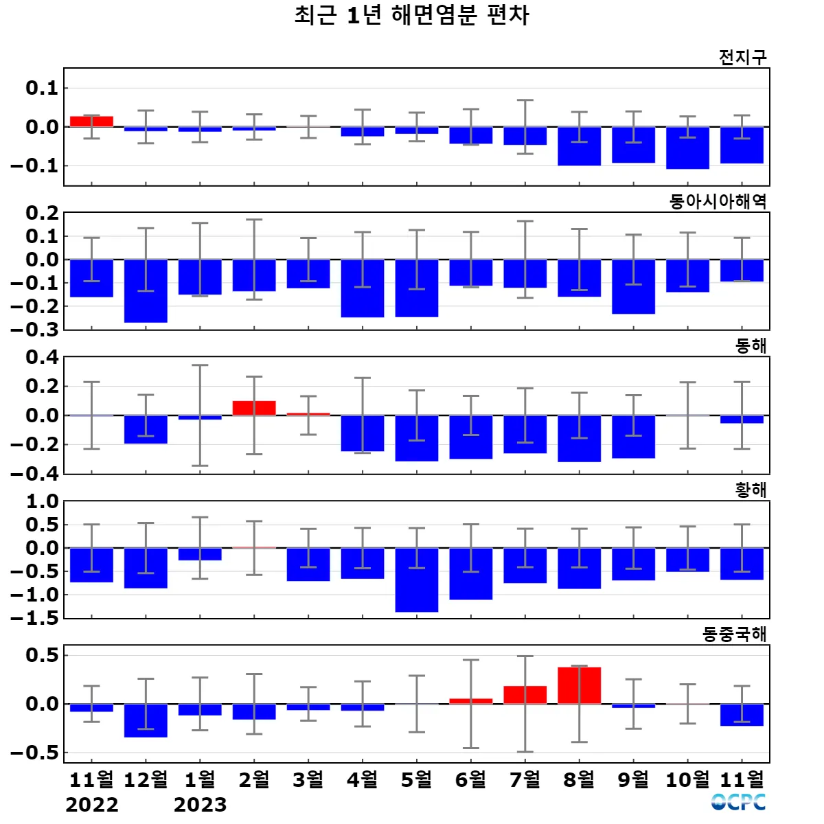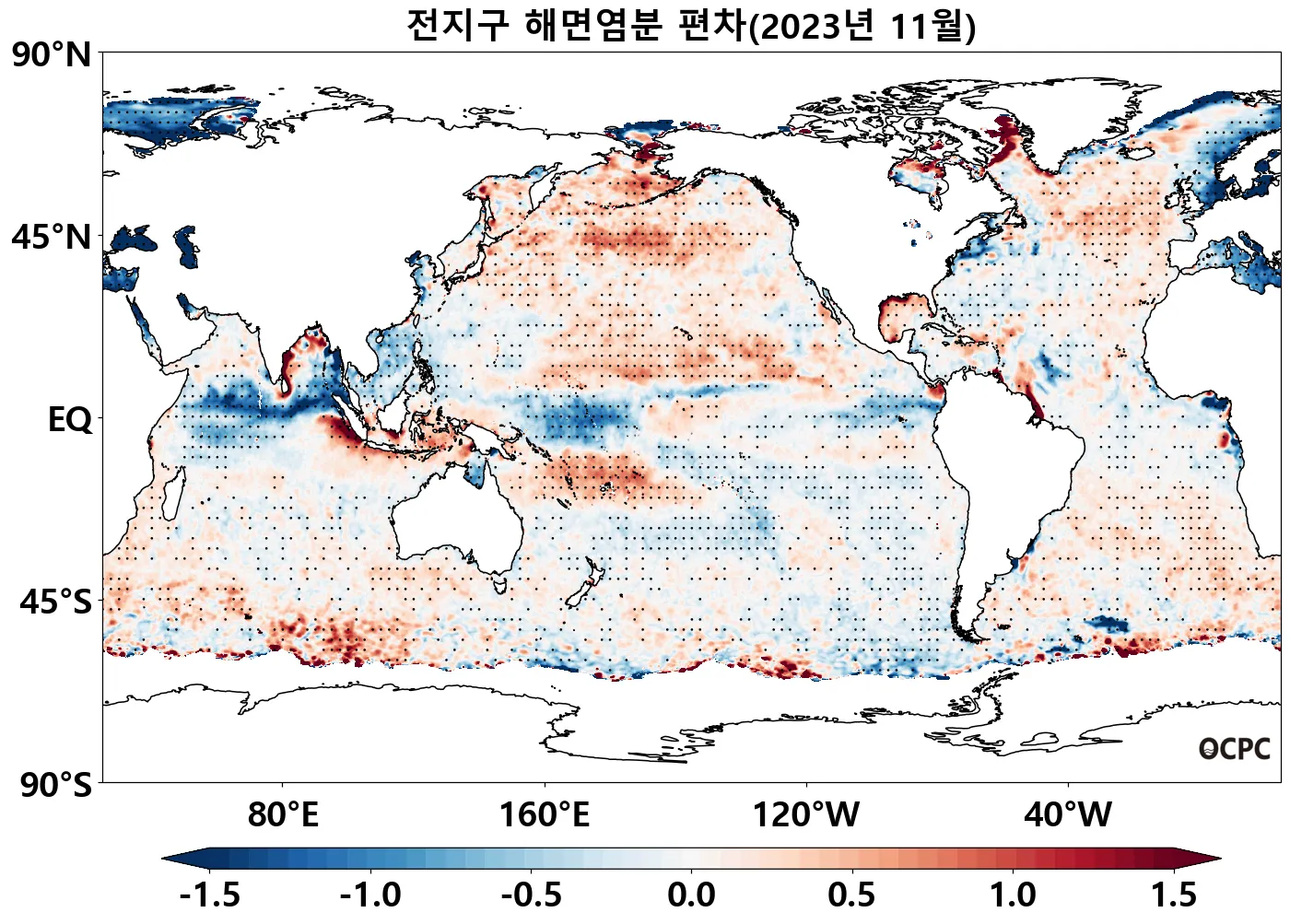 인공위성(SMAP)을 이용한 해면염분 추정 자료는 2015년 4월부터 활용가능하나 기간이 짧고 다른 자료에 비해서 불확실성이 큽니다. 2023년부터는 8년 정도의 자료가 확보되는 시점이어서 기간 평균 대비 월별 편차를 시범적으로 제공하오니 참고하시기 바랍니다.