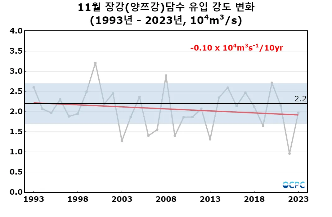 1993~2023년 동안 11월 장강 담수 유입 강도는 10년에 초당 1,000톤(한 달 동안 유입된 담수량으로 환산하면 10년에 2.6기가톤)씩 감소하는 추세입니다.