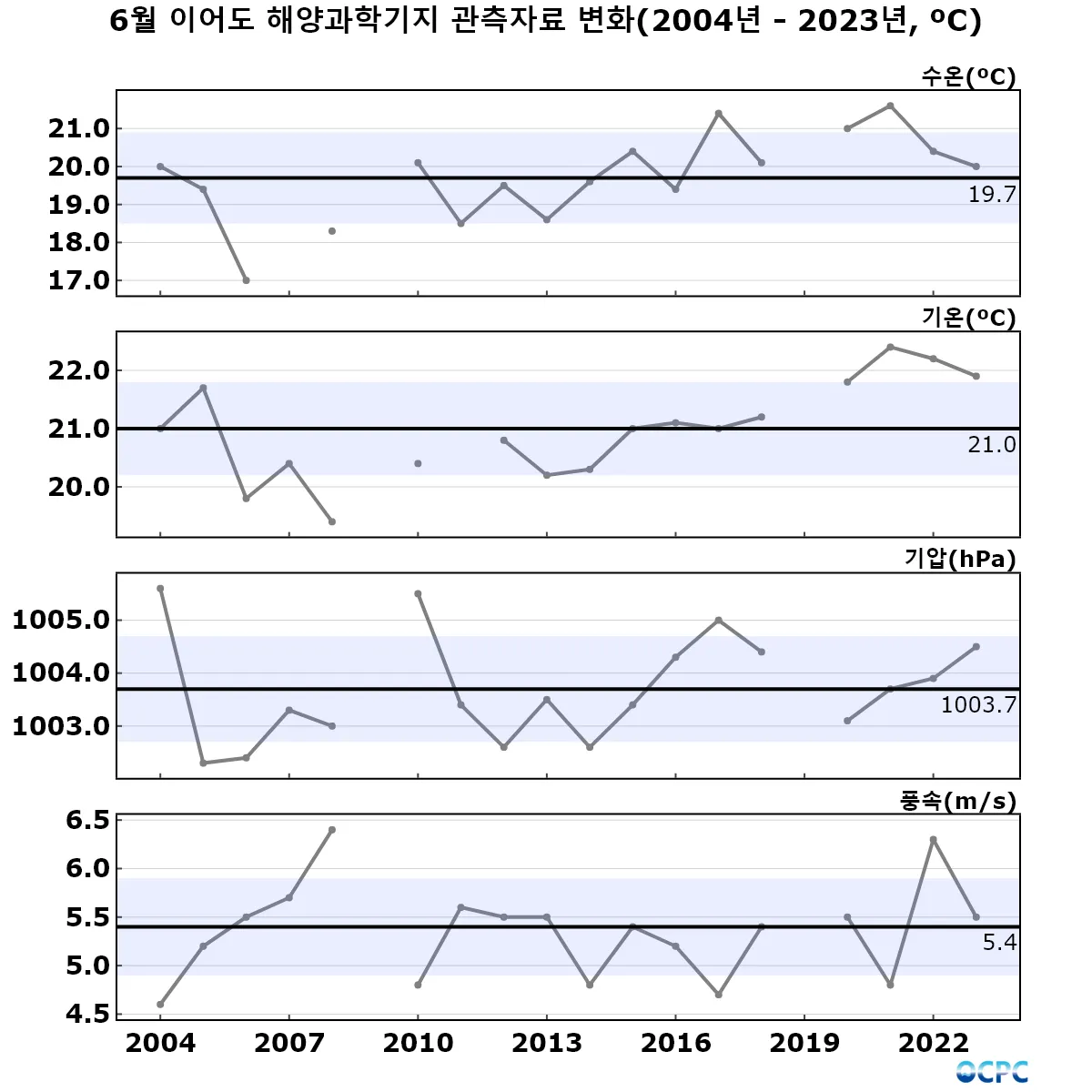 이어도 기지의 6월 평균 기온은 2004-2023년 중 세번째로 높았습니다(2021년 22.4℃, 2022년 22.2℃).