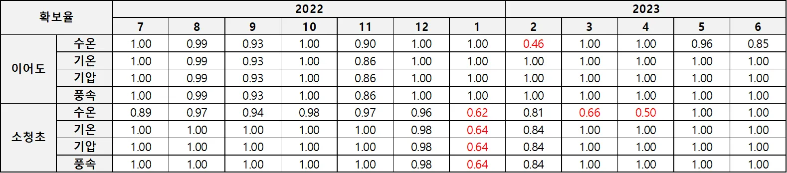 해양과학기지 관측요소별 관측자료 월별 확보율(2022-2023). 최대가 1.0이며 붉은색은 월 확보율 0.8(수온은 0.7) 미만인 자료로 분석에서 제외