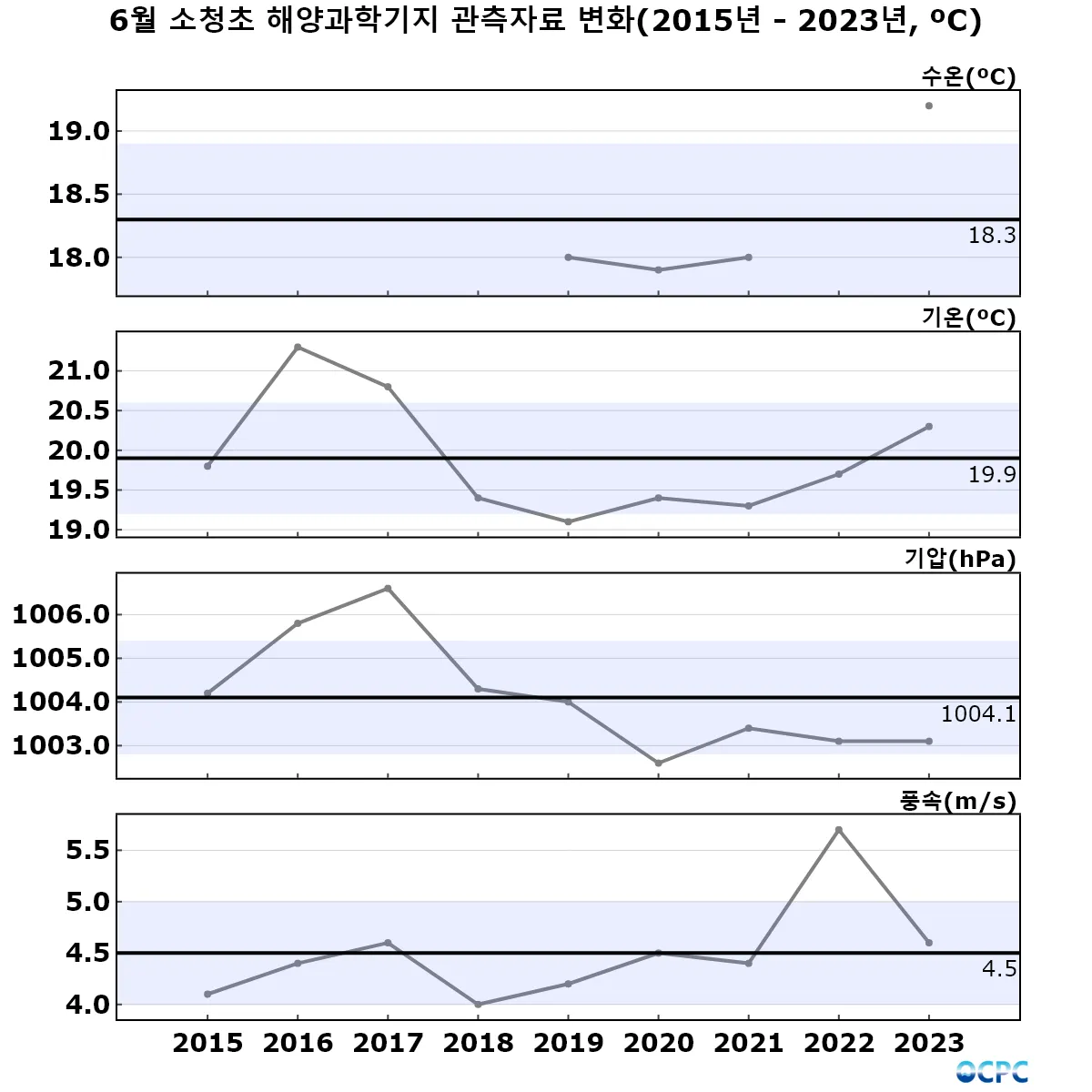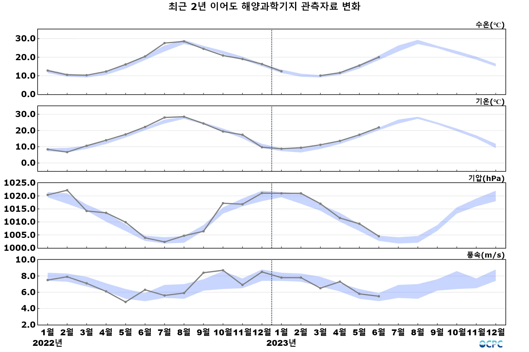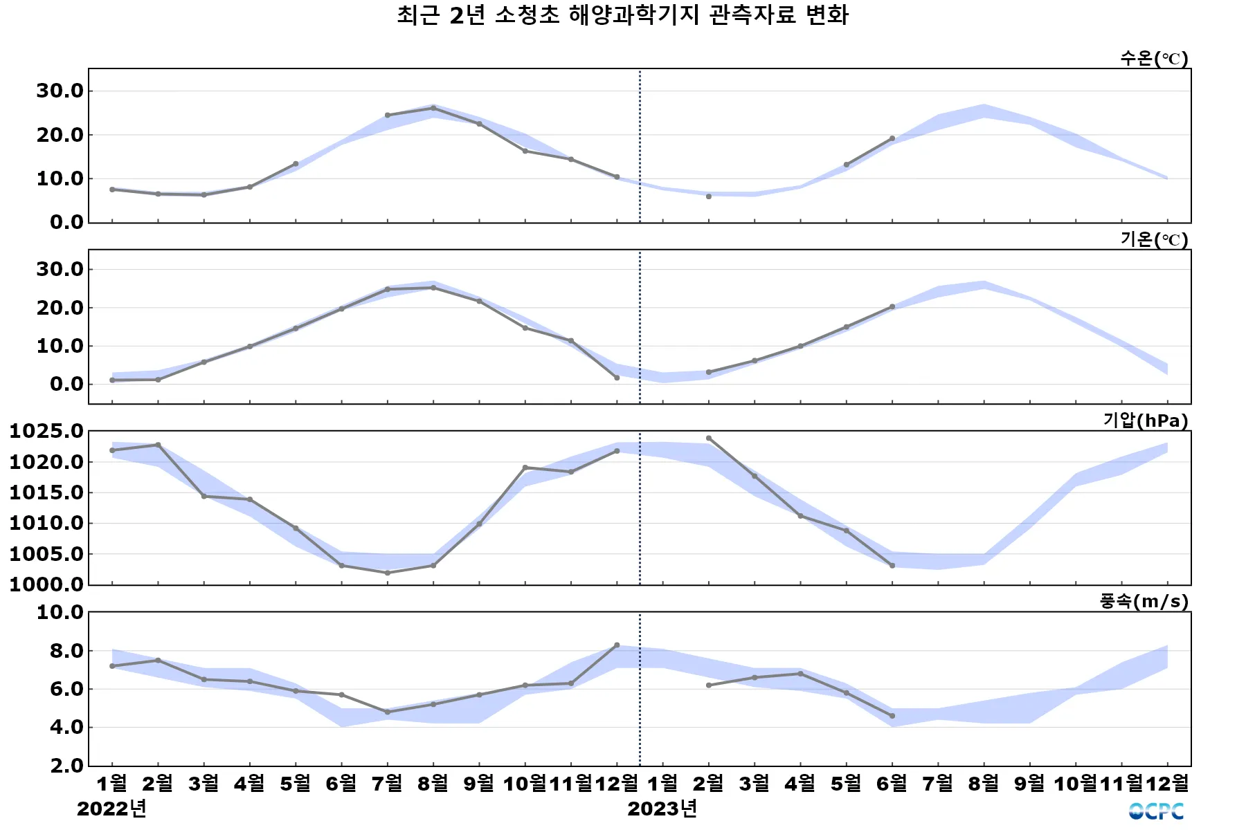 ※ 본 ‘해양과학기지 자료 분석 (2023년 6월)’은 분석은 국립해양조사원에서 제공하는 해양과학기지 관측자료를 사용하였음