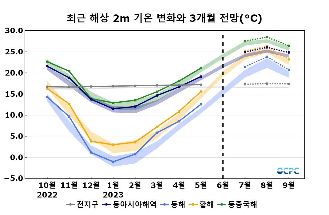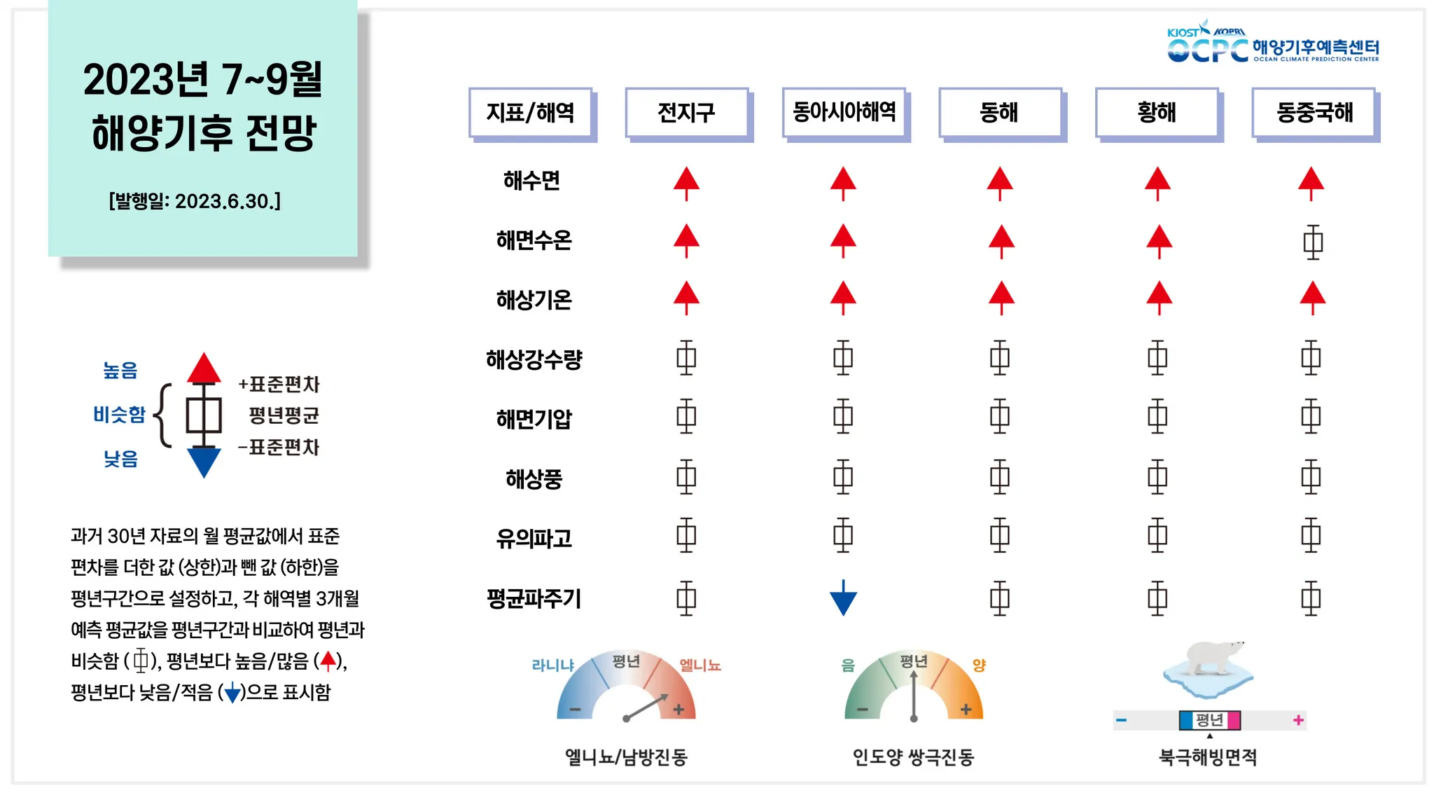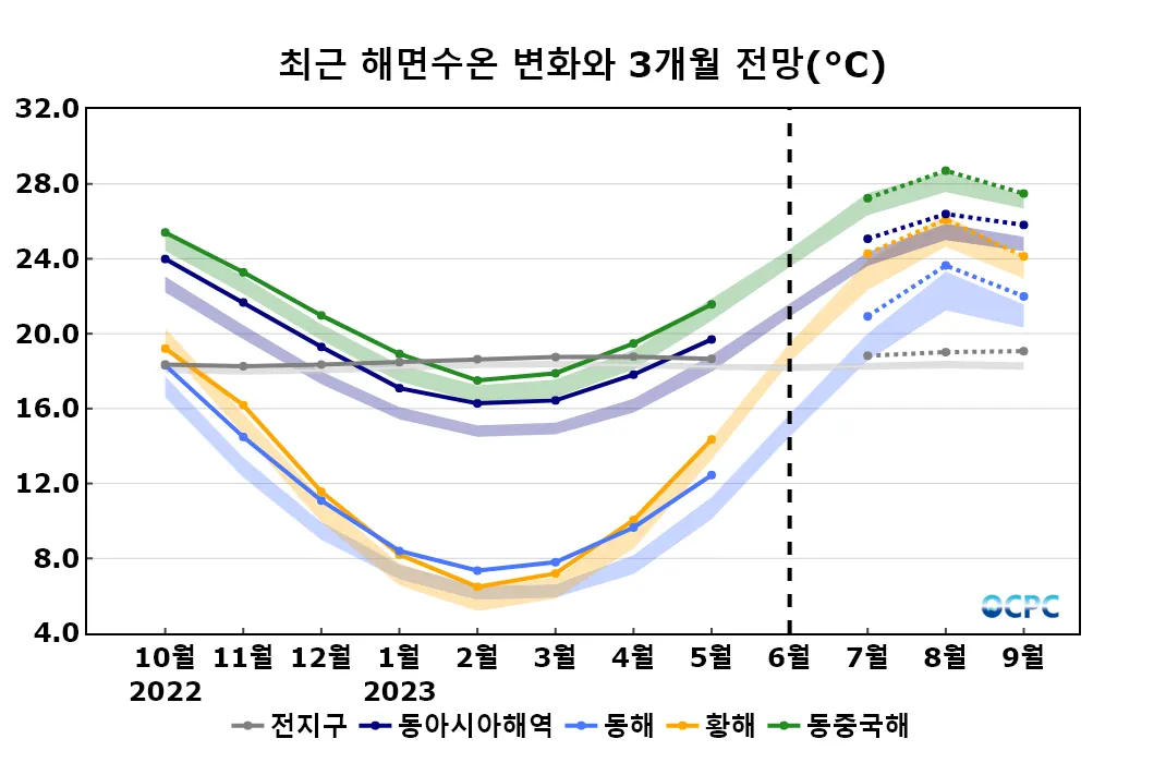 동해, 황해, 동중국해의 7~9월 평균 해상기온은 평년(20.6±0.9℃, 23.9±0.6℃, 26.8±0.5℃)보다 높은 기온이 전망됩니다.