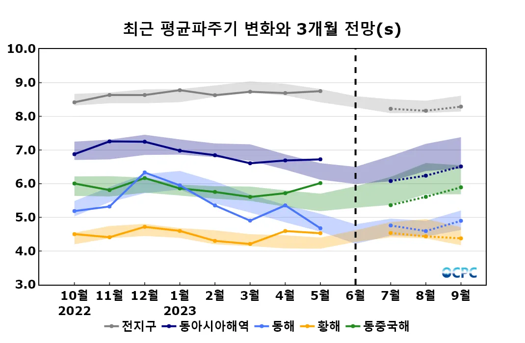 동해, 황해, 동중국해의 평균파주기는 평년(4.8±0.3초, 4.6±0.2초, 6.0±0.4초)과 비슷할 것으로 전망됩니다.