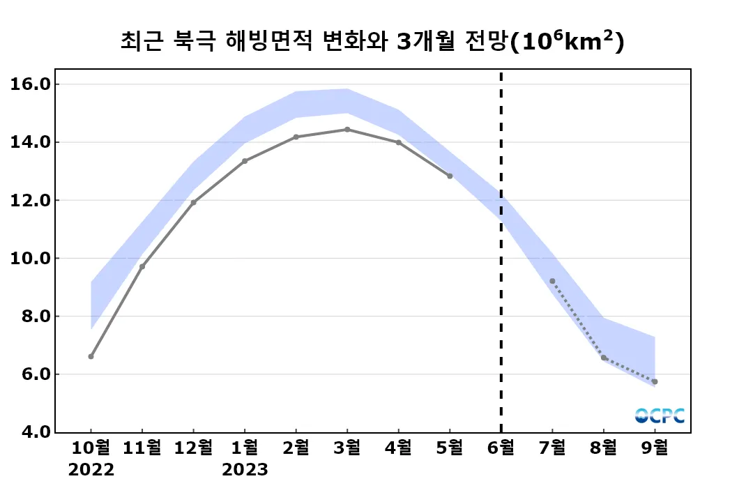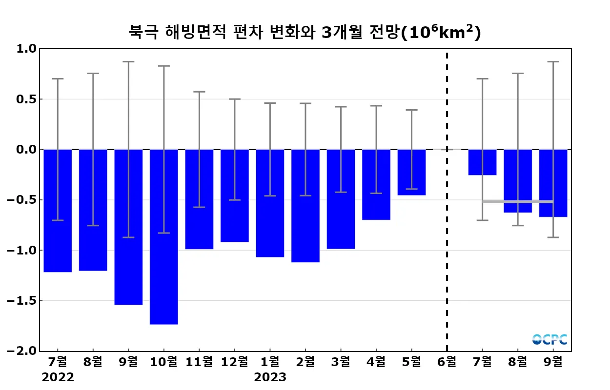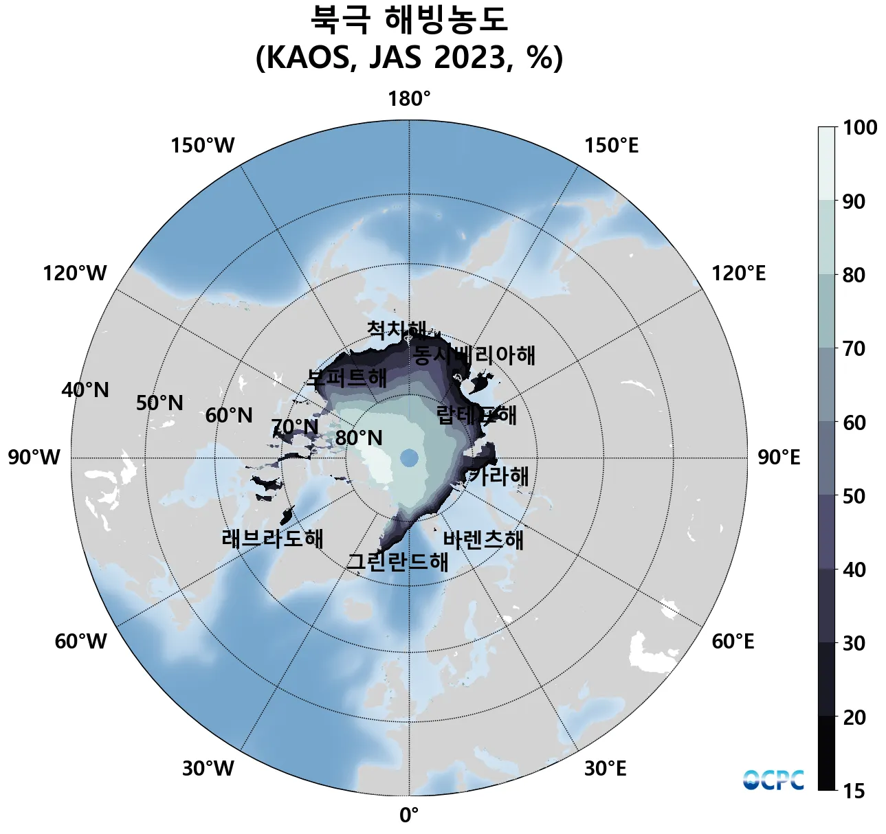 A. 북극 해빙농도 전망(2023년 7~9월 평균, 15% 이상 해역)
