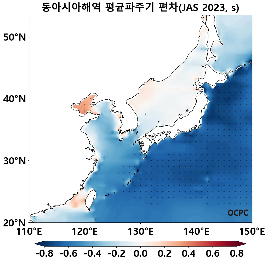 A-B. 동아시아해역 평균파주기 편차 전망(2023년 7~9월 평균, 점표시: 평년 표준편차 초과 해역)