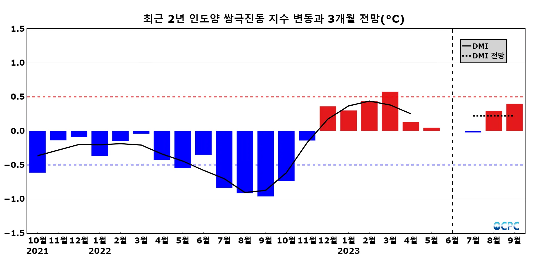 인도양 쌍극진동 지수 DMI (Dipole Mode Index)는 WTIO 해역의 평년 대비 편차에서 SETIO 해역의 평년 대비 편차를 뺀 값으로 월평균 해면수온 편차(채색부분)를 3개월 이동평균하여 나타낸 지수(검정색 실선)로 0.5보다 크면 양의 상태, -0.5보다 작으면 음의 상태로 판정합니다. 과거 지수(최근 2년)는 OISSTv2.1, 전망은 CFSv2 자료에서 산출하였으며, 검정색 점선은 3개월 전망값의 평균값을 나타냅니다.