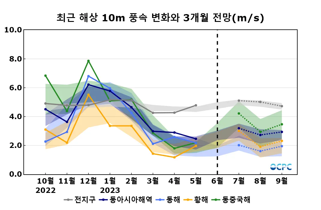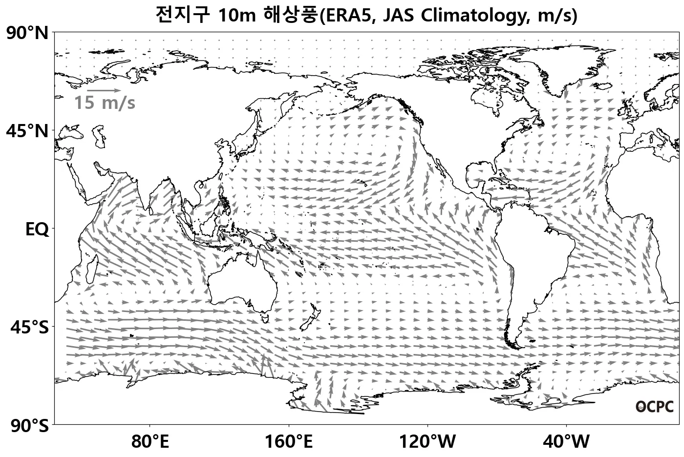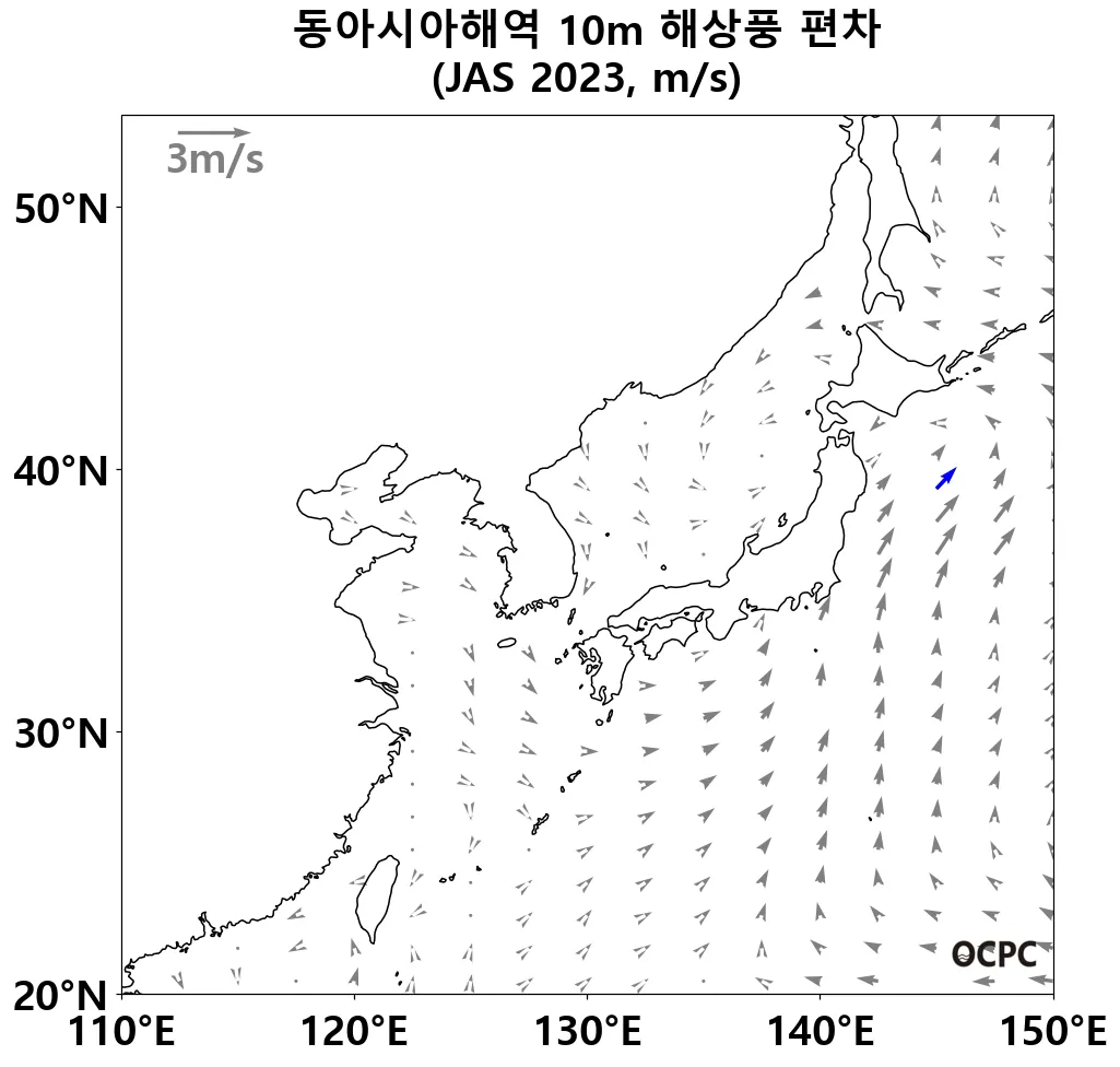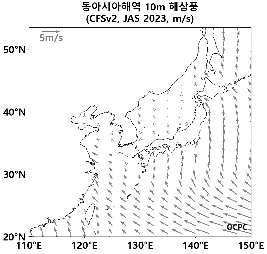 동아시아해역의 7~9월 평균 해상풍속은 평년(2.8±0.4m/s)과 비슷하겠습니다.
