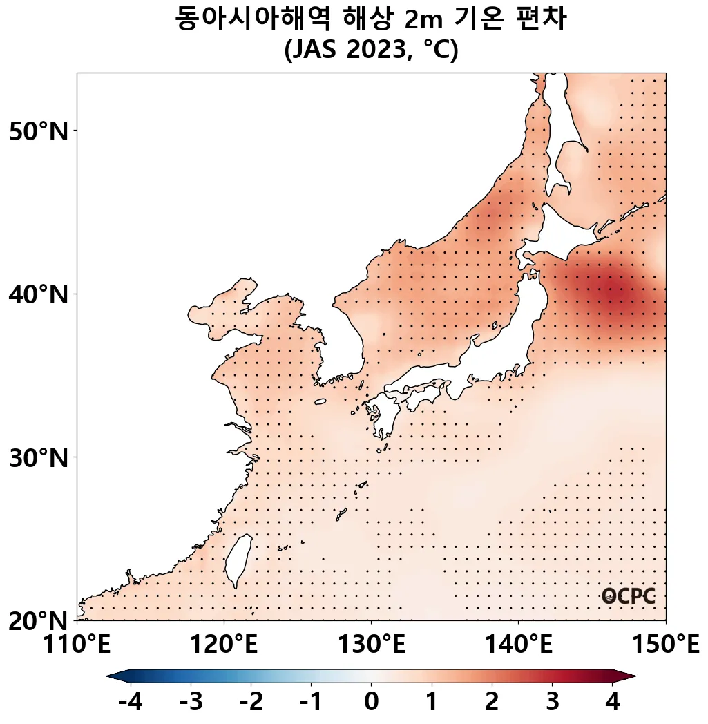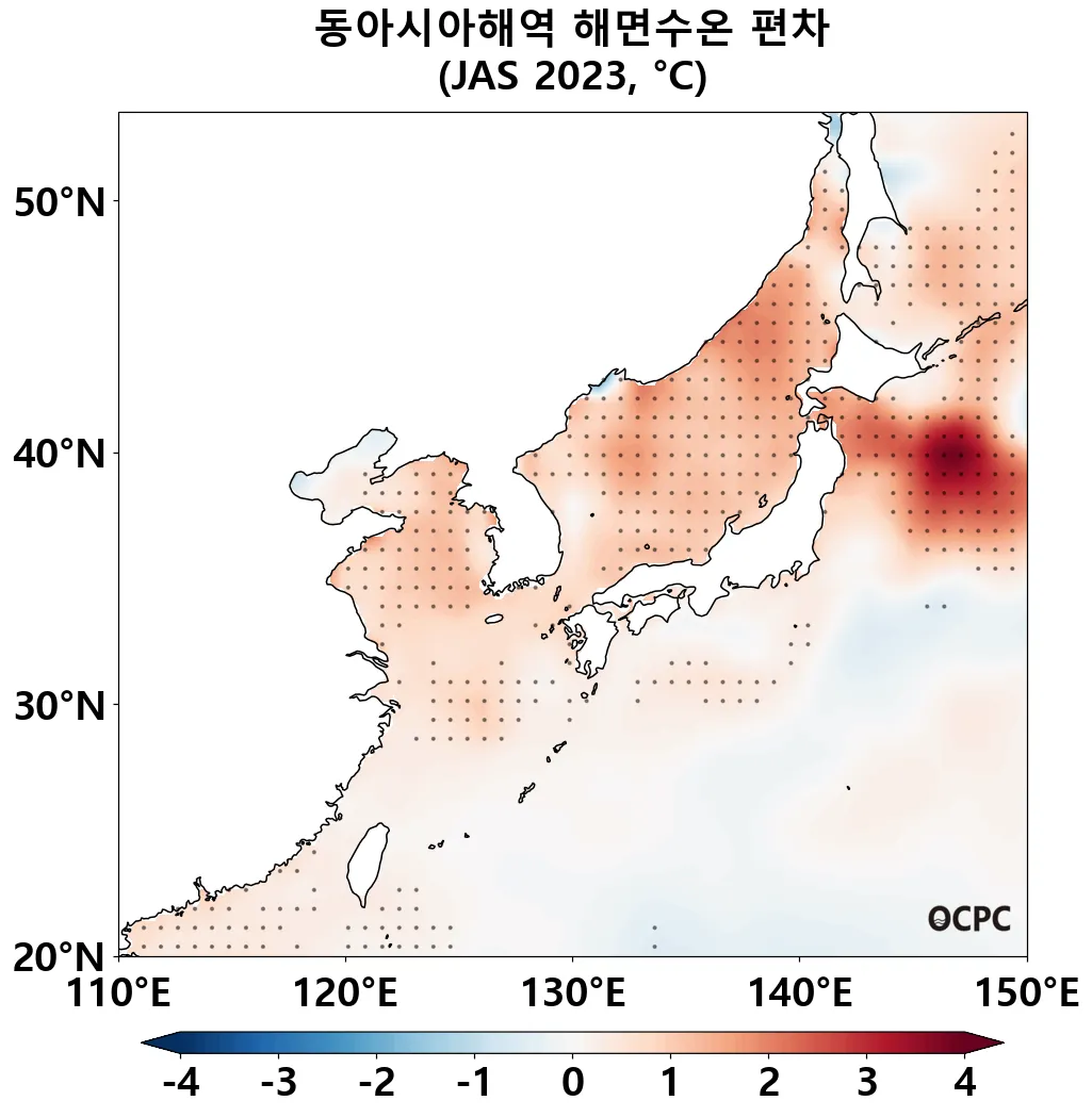 A-B. 동아시아해역 해상기온 편차 전망(2023년 7~9월 평균, 점표시: 평년 표준편차 초과 해역)