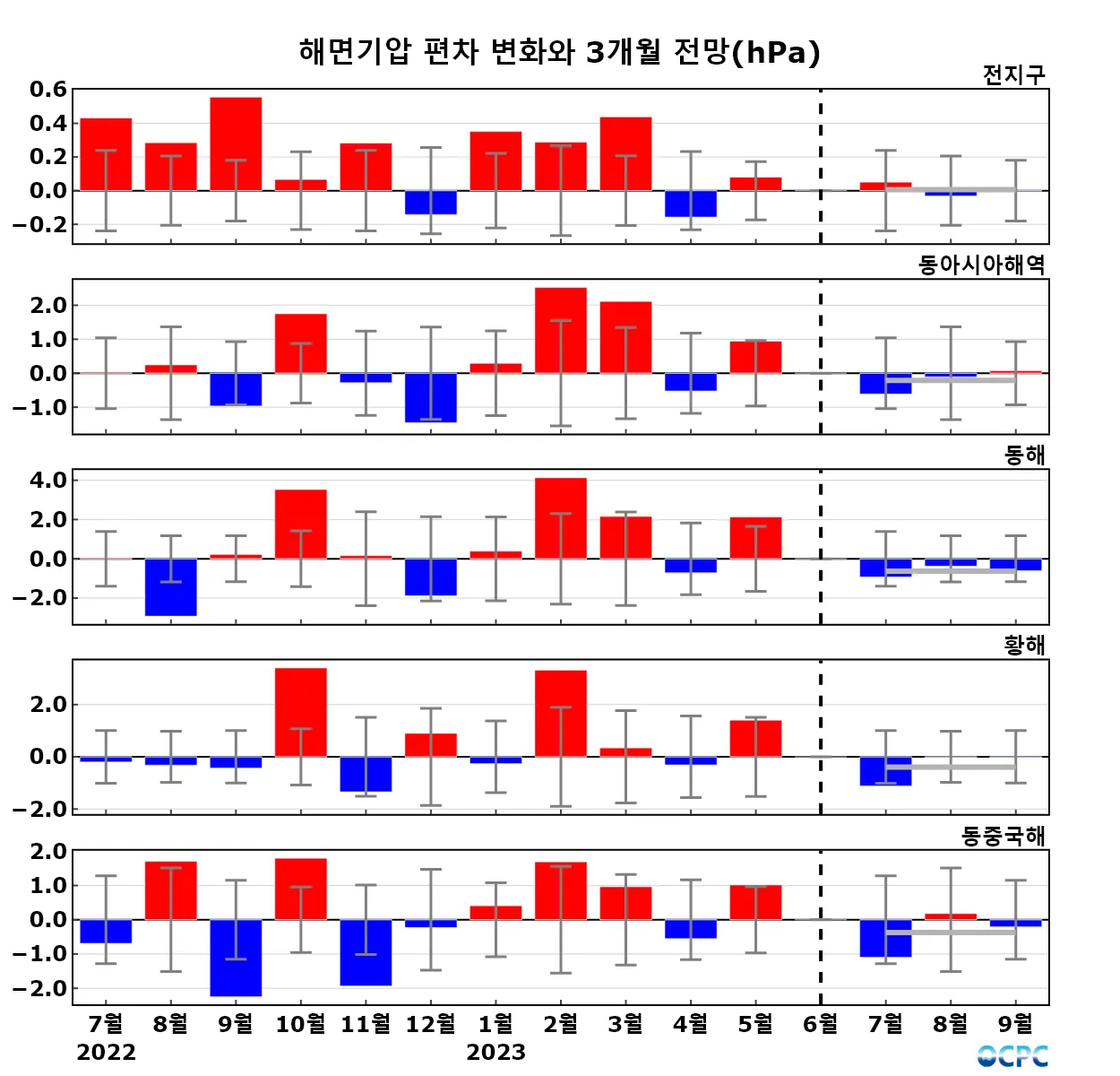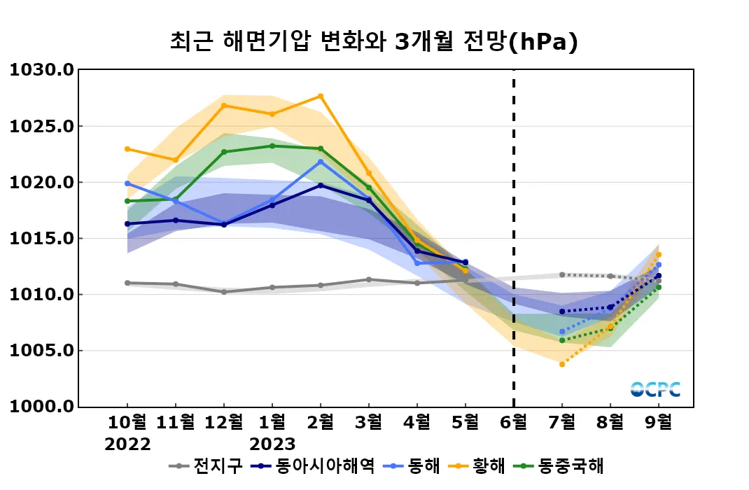 동해, 황해, 동중국해의 7~9월 평균 해면기압은 평년(1010.0±1.2hPa, 1008.5±1.0hPa, 1008.2±1.3hPa)과 비슷하겠습니다.