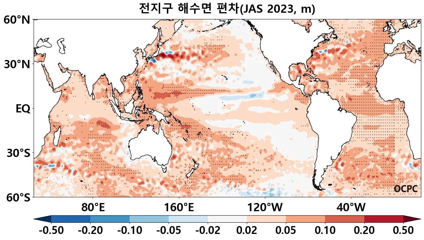 A-B. 전지구 해수면 편차 전망(2023년 7~9월 평균, 점표시: 평년 표준편차 초과 해역)