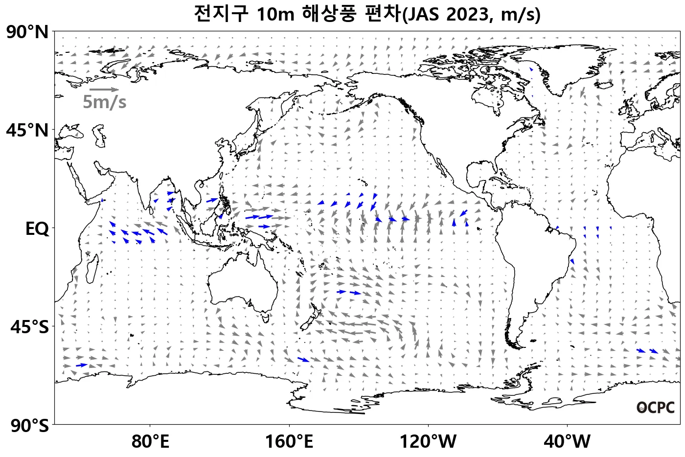 A-B. 전지구 해상풍 편차 전망(2023년 7~9월 평균, 청색벡터: 평년 표준편차 초과 해역)