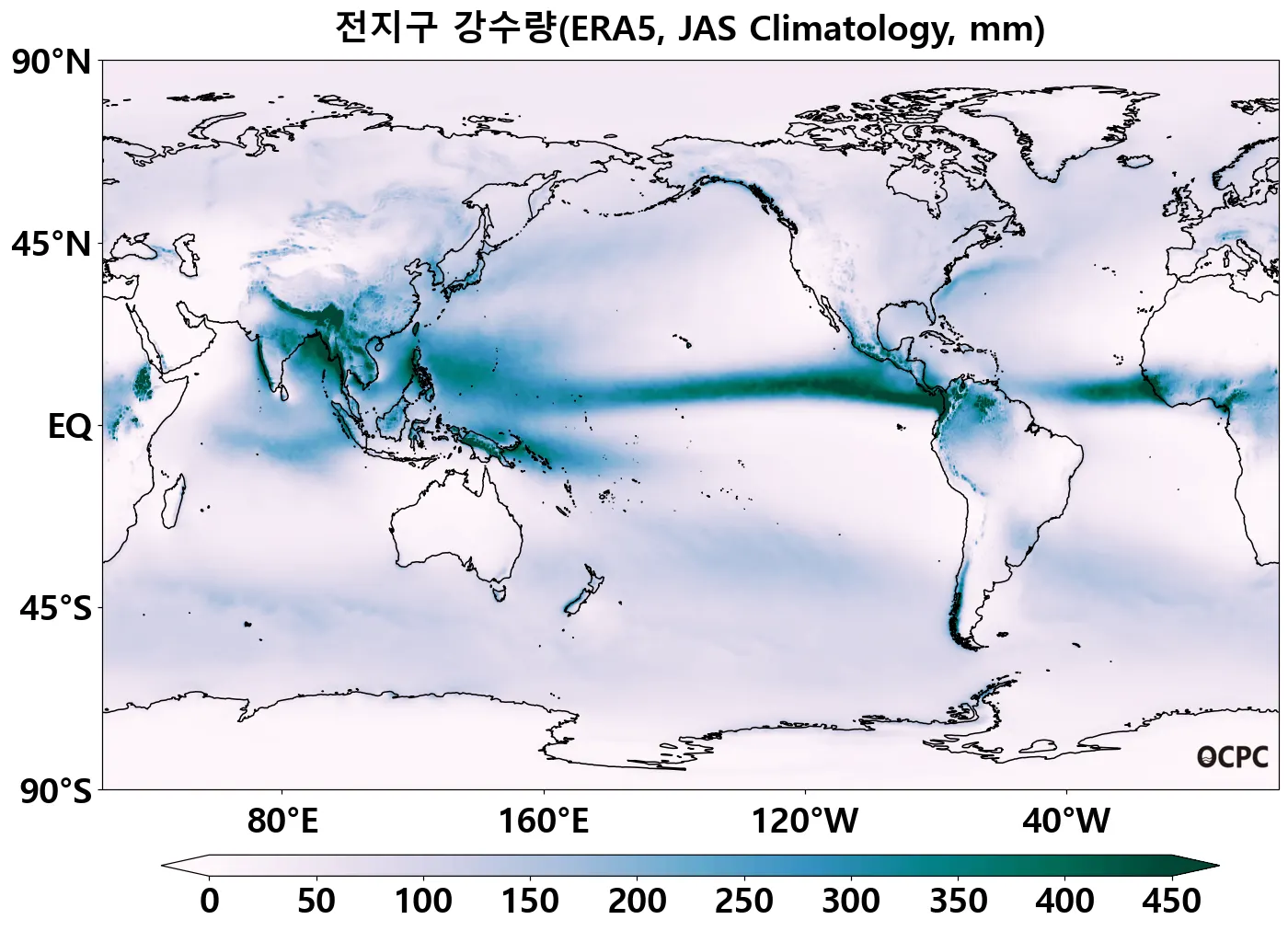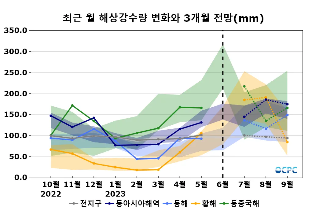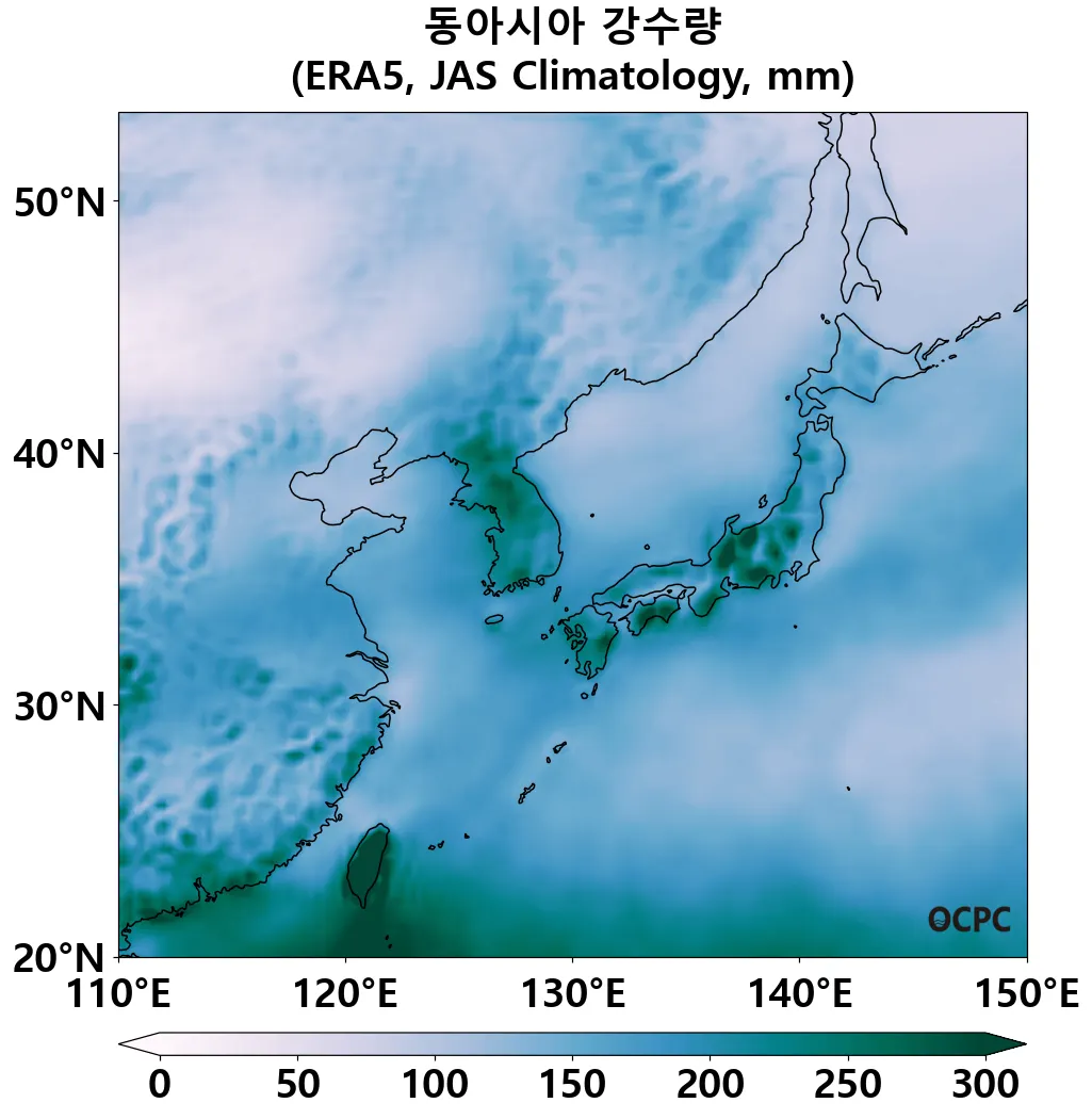 동아시아해역의 7~9월 평균 해상강수량은 평년(159.2±21.4mm)과 비슷하겠습니다.