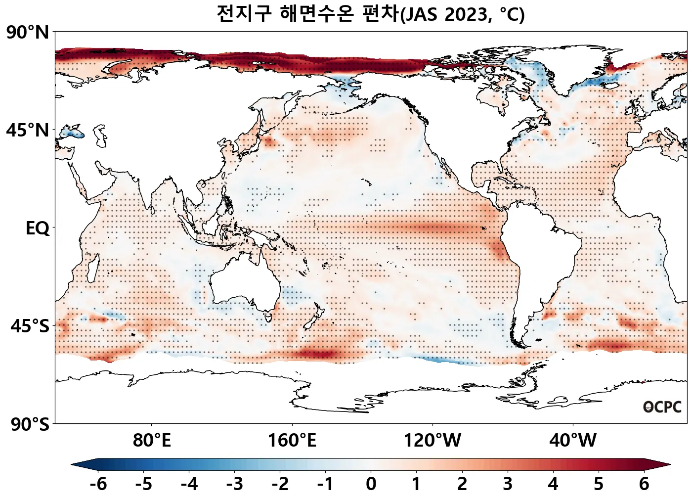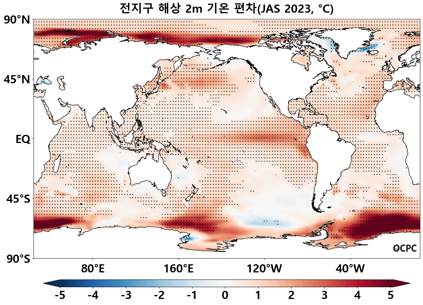 A-B. 전지구 해상기온 편차 전망(2023년 7~9월 평균, 점표시: 평년 표준편차 초과 해역)