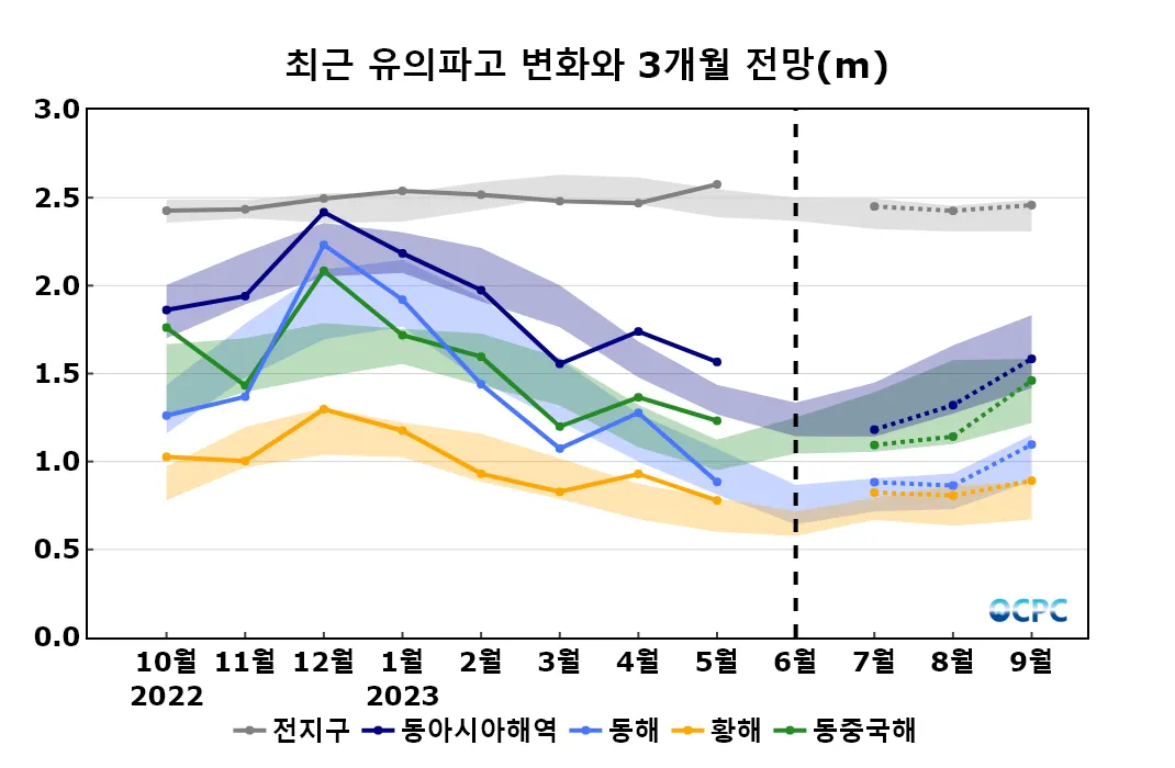 동해, 황해, 동중국해의 평균 유의파고는 평년(0.9±0.1m, 0.8±0.1m, 1.3±0.1m)과 비슷할 것으로 전망됩니다.