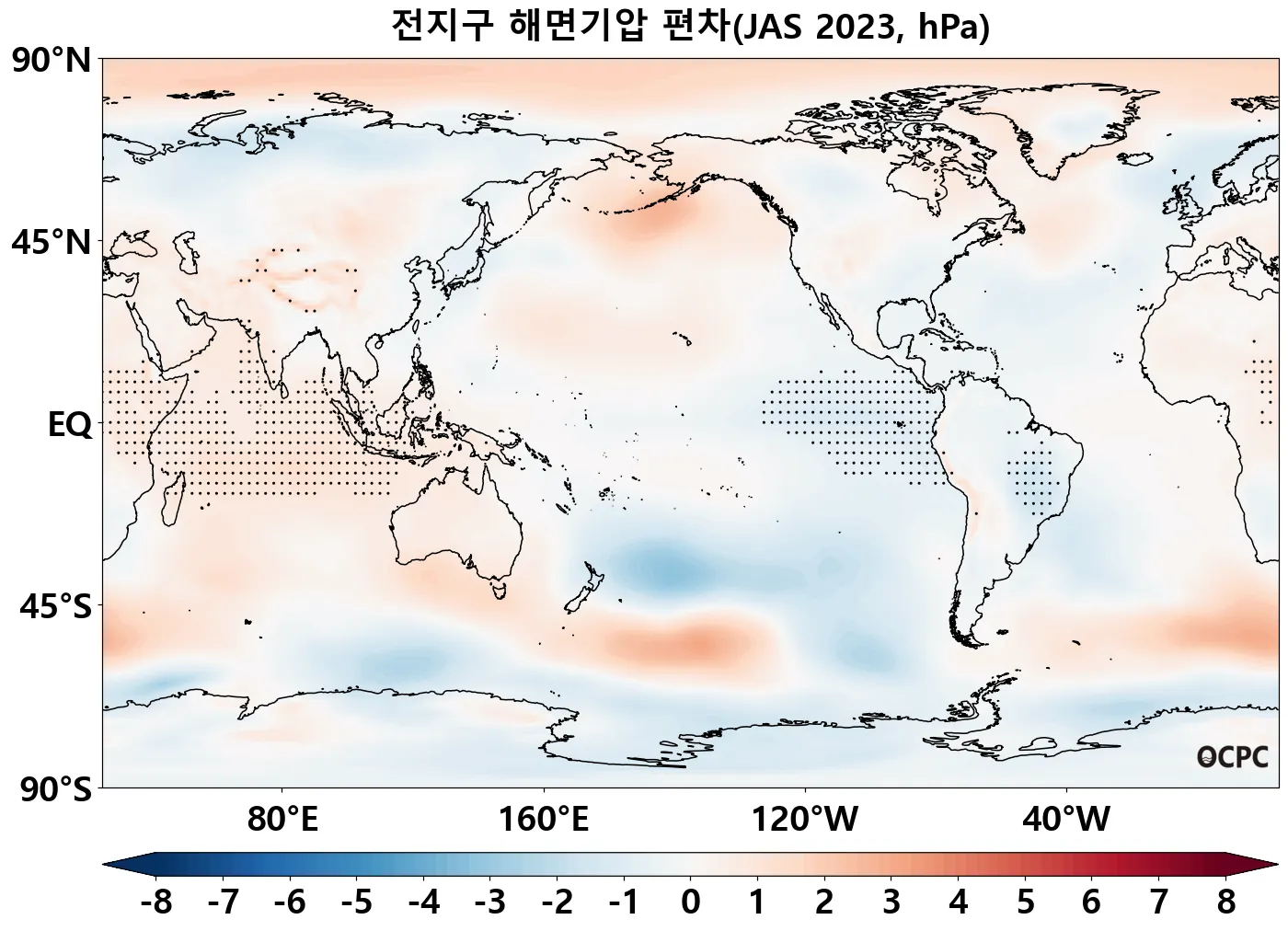 A-B. 전지구 해면기압 편차 전망(2023년 7~9월 평균, 점표시: 평년 표준편차 초과 해역)