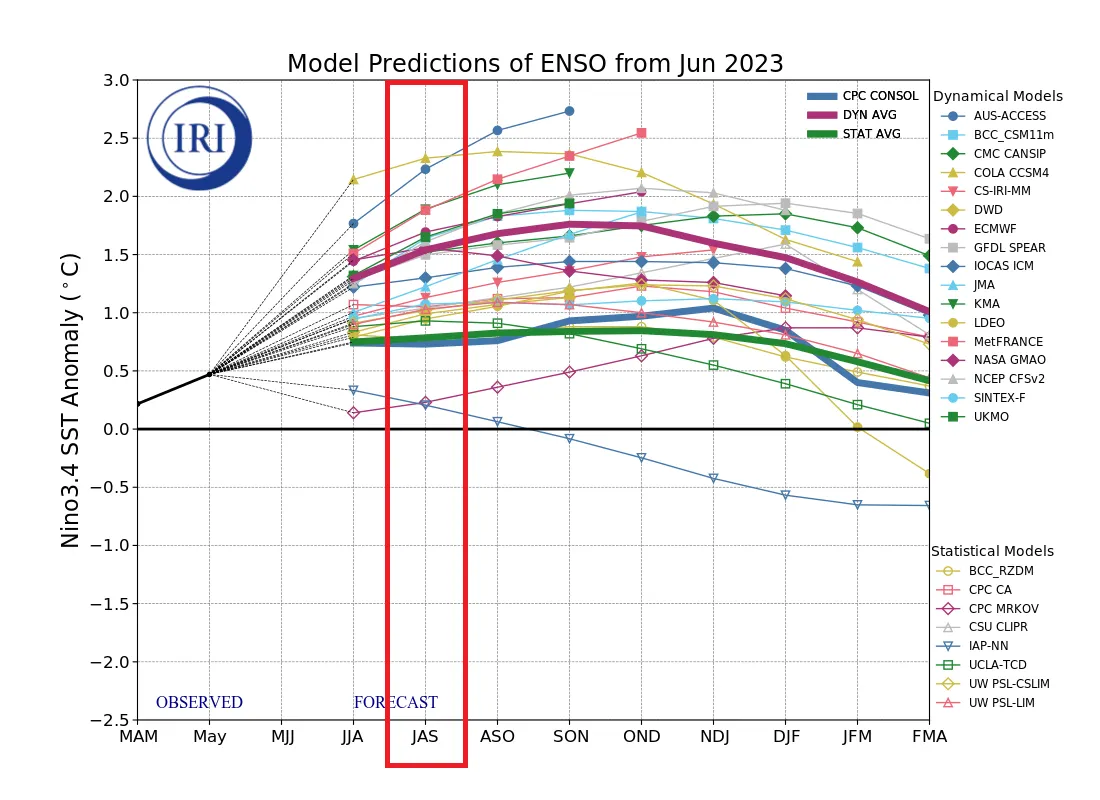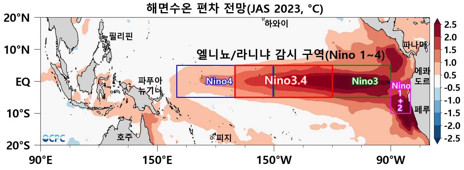 엘니뇨/라니냐 감시구역인 Nino3.4 해역(5°S~5°N, 170°W~120°W)의 7~9월(JAS) 평균 해면수온 편차는 0.5°C 이상으로 엘니뇨 상태일 것으로 전망됩니다.
