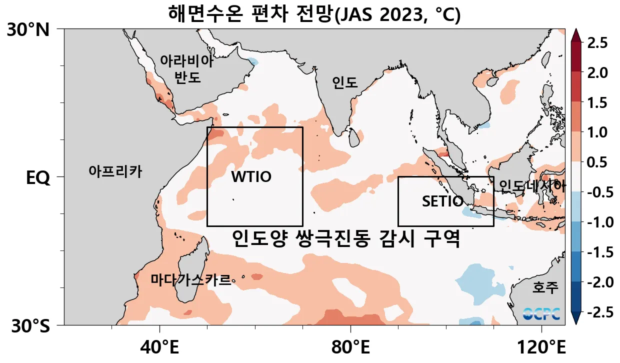 2023년 7~9월(JAS) 열대 서인도양 해역(WTIO)과 남동인도양 해역(SETIO) 평균 해면수온 편차 차이가 크지 않아 인도양 쌍극진동 지수는 중립 상태일 것으로 전망됩니다.