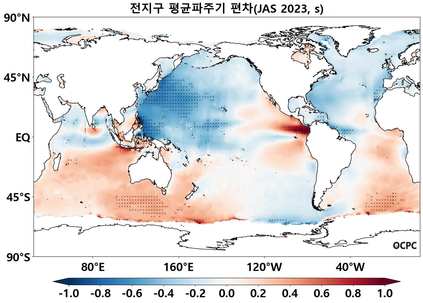 A-B. 전지구 평균파주기 편차 전망(2023년 7~9월 평균, 점표시: 평년 표준편차 초과 해역)