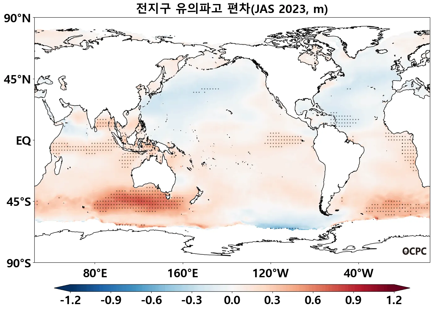 A-B. 전지구 유의파고 편차 전망(2023년 7~9월 평균, 점표시: 평년 표준편차 초과 해역)