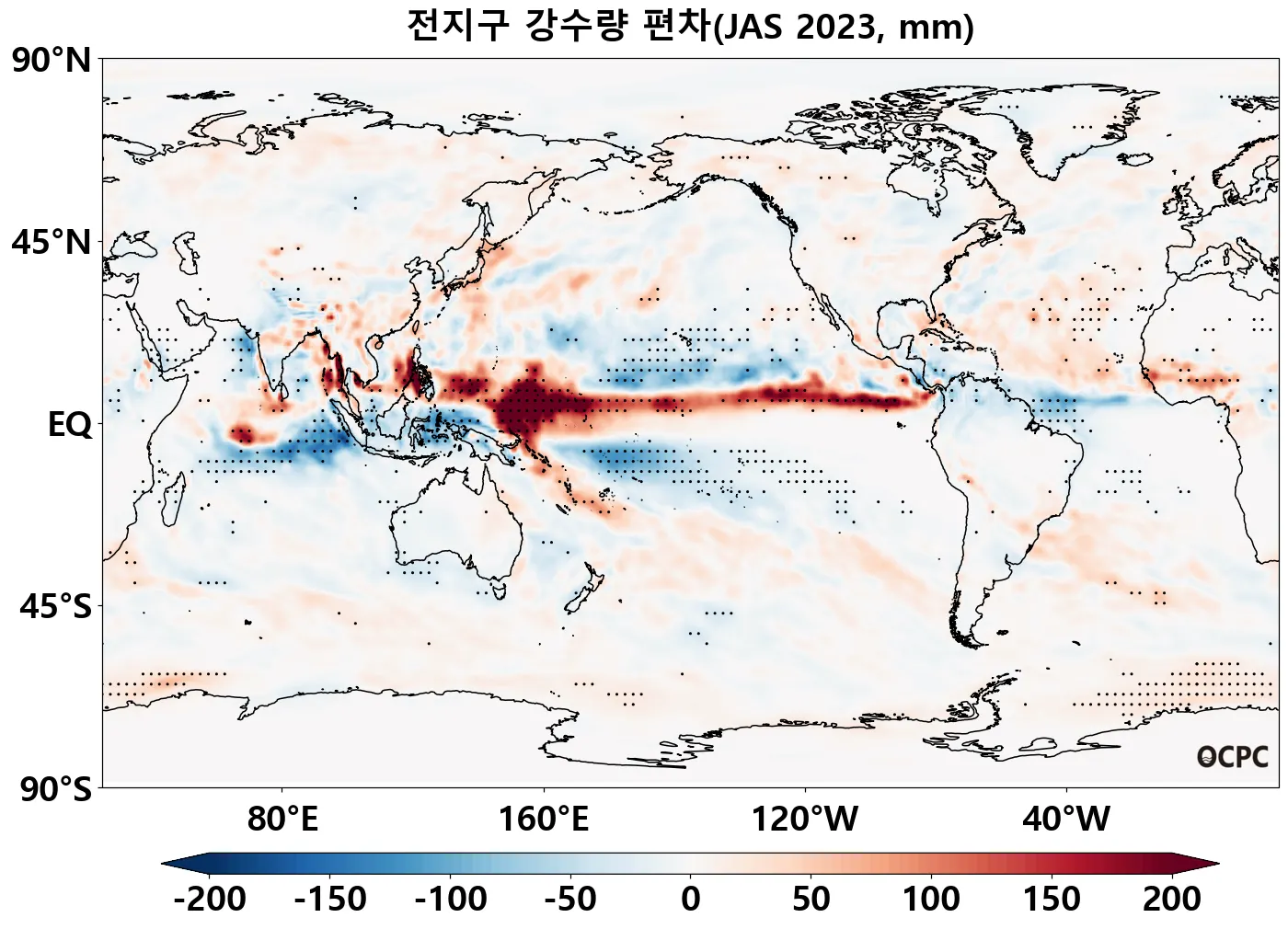 A-B. 전지구 강수량 편차 전망(2023년 7~9월 평균, 점표시: 평년 표준편차 초과 해역)