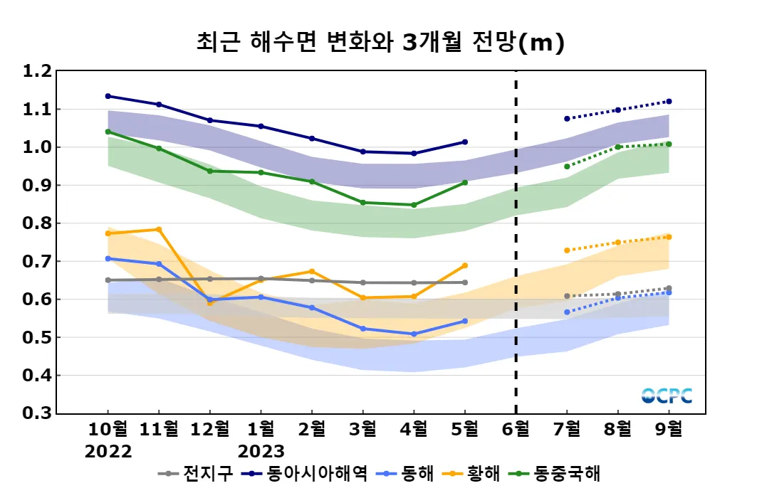 동해, 황해, 동중국해의 7~9월 평균 해수면은 평년(0.54±0.04m, 0.69±0.05m, 0.94±0.04m)보다 높겠습니다.