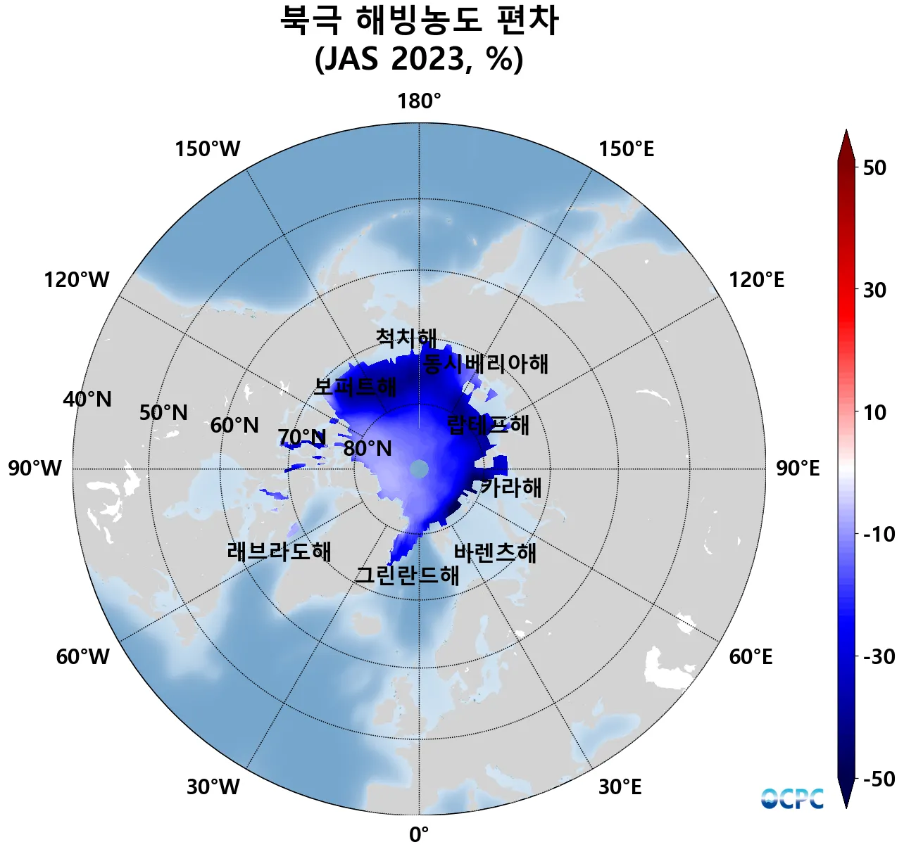 A-B. 북극 해빙농도 편차 전망(2023년 7~9월 평균, 15% 이상 해역)