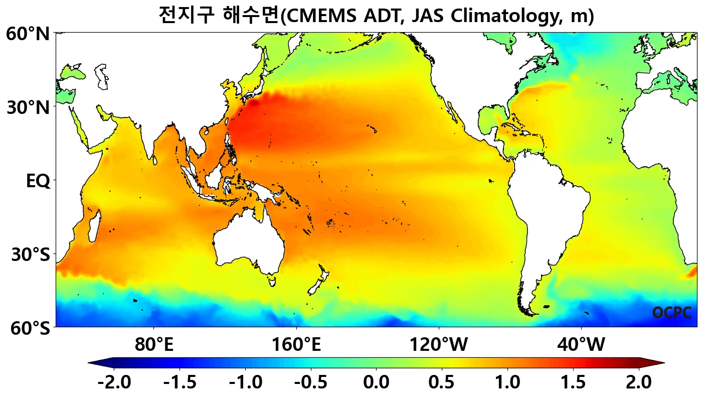 해수면 높이는 가상의 지오이드면(Geoid, 중력포텐셜이 같은 면)을 기준으로 환산한 절대 해수면 높이(Absolute Dynamic Topography, ADT)로서 절댓값 보다는 상대적인 변화와 차이가 더 중요합니다.