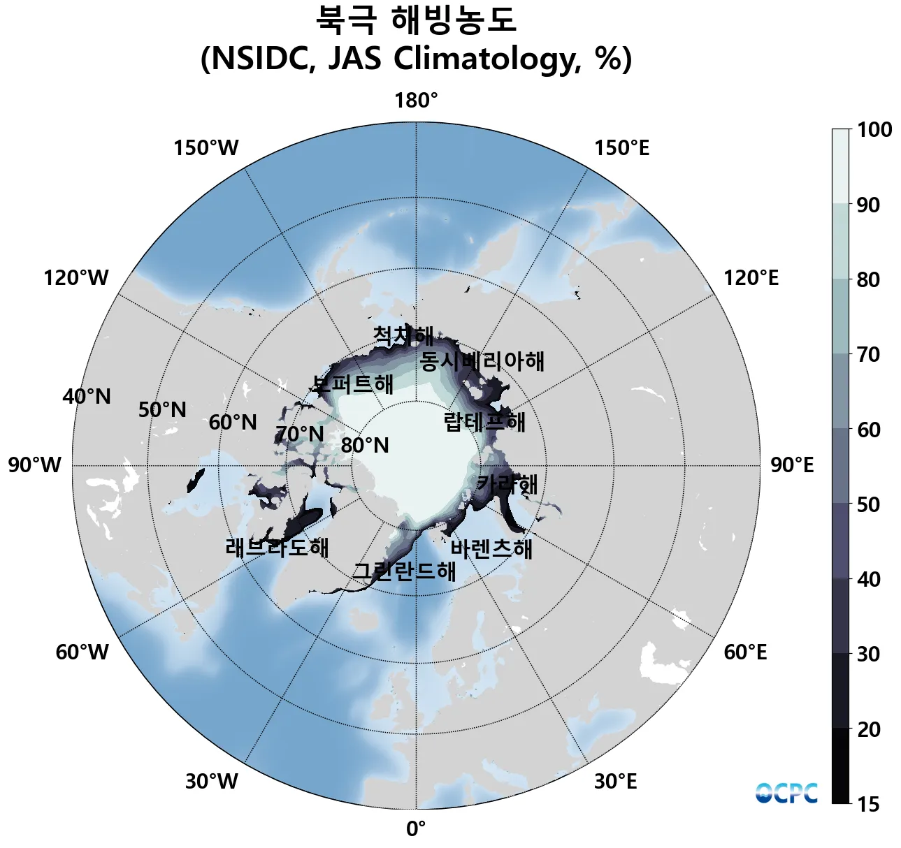 B. 북극 해빙농도(평년 7~9월 평균, 15% 이상 해역)
