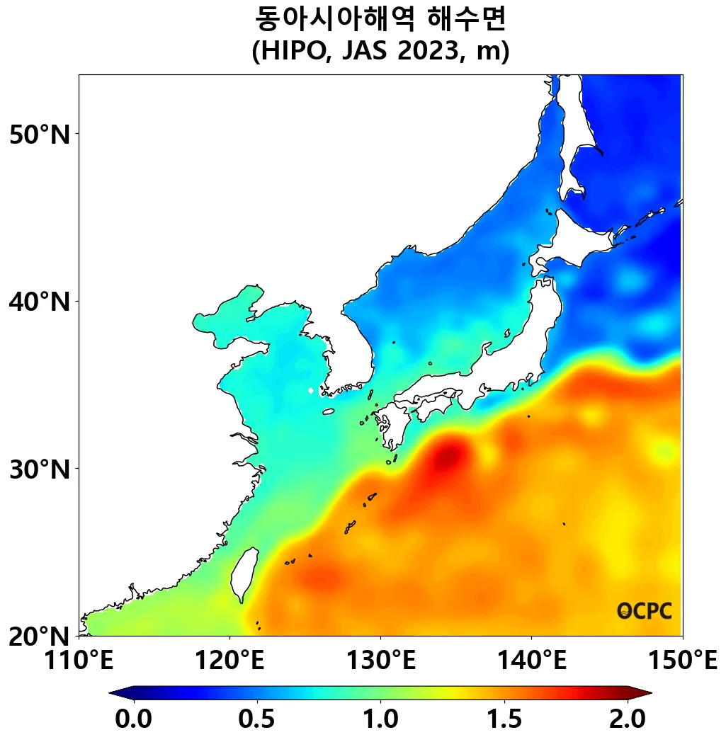 동아시아해역의 7~9월 평균 해수면은 평년(1.03±0.03m)보다 높겠습니다.