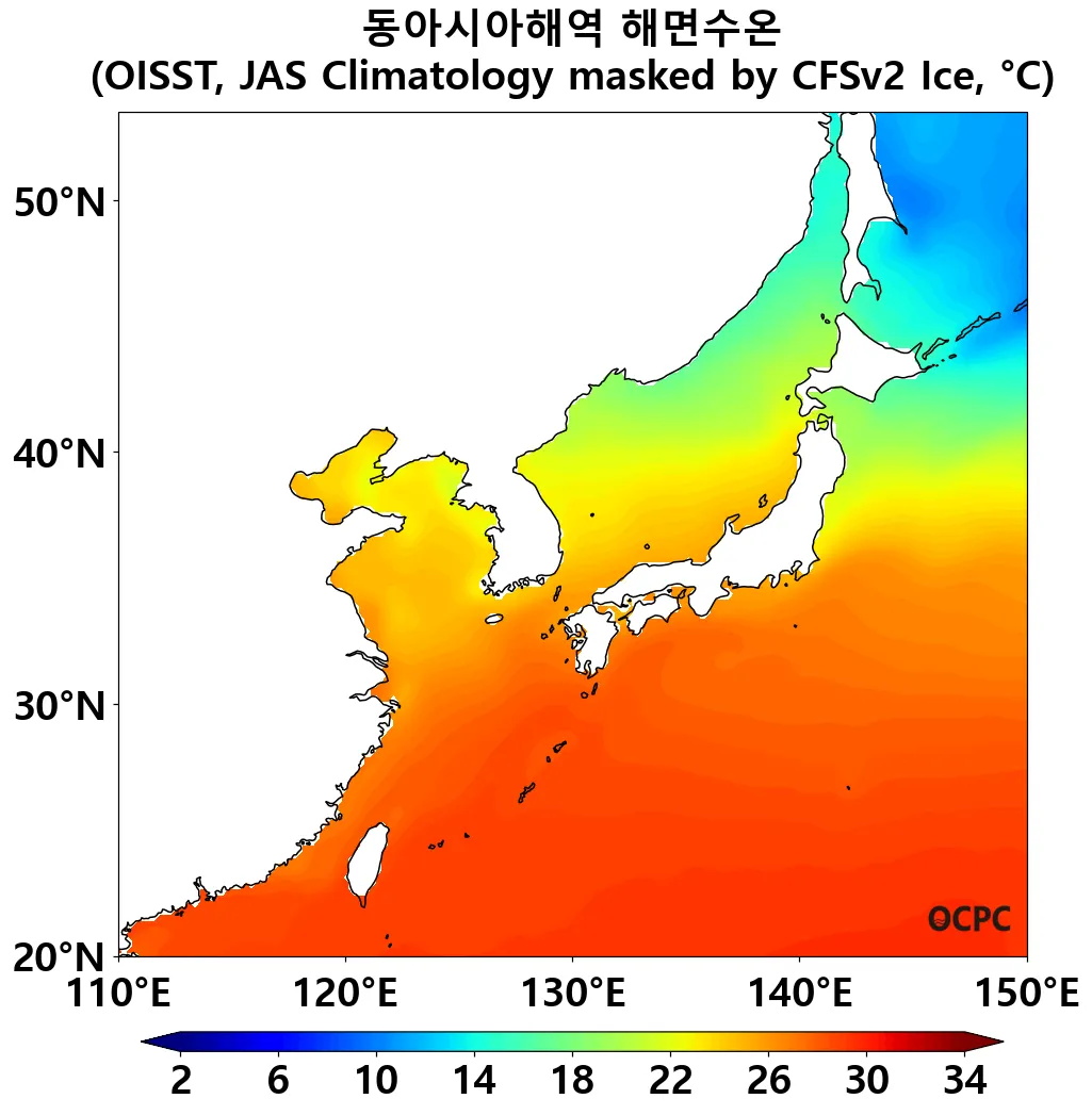 동아시아해역의 7~9월 평균 해상기온은 평년(24.4±0.4℃)보다 높겠습니다.