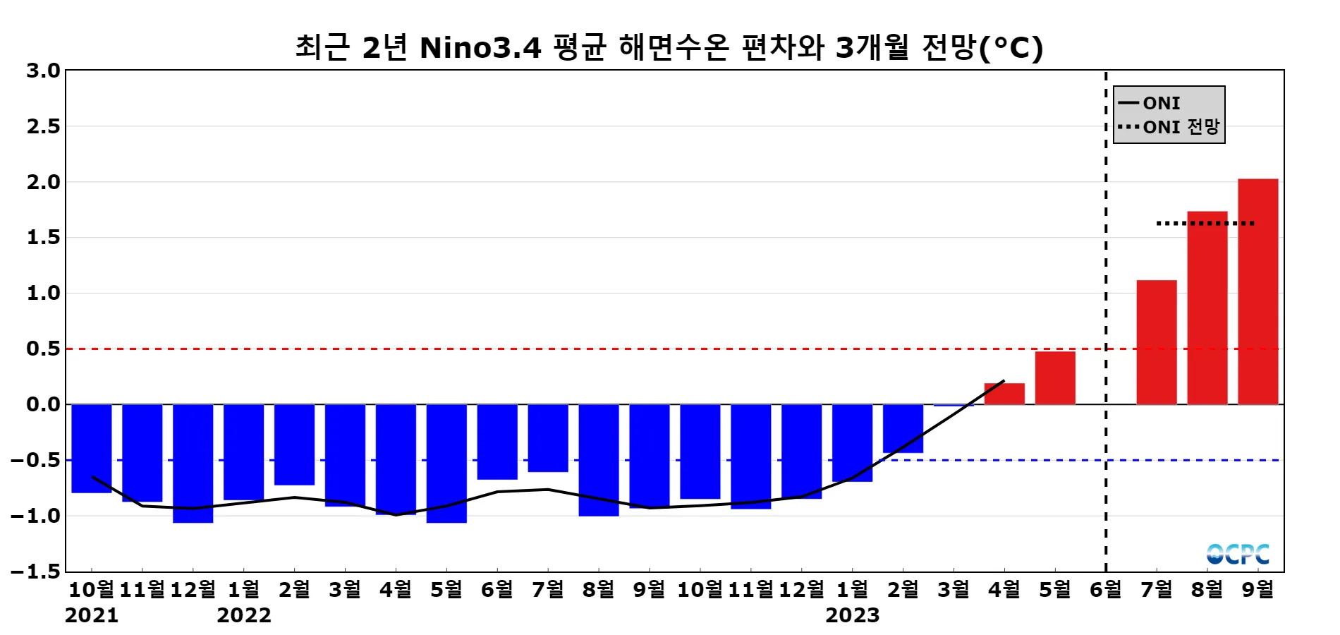 엘니뇨/라니냐 지수(ONI, Ocean Nino Index): 엘니뇨/라니냐 감시구역인 Nino3.4 해역의 월평균 해면수온 편차(채색부분)를 3개월 이동평균하여 나타낸 지수(검정색 실선)로 0.5보다 크면 엘니뇨, -0.5보다 작으면 라니냐로 판정합니다. 과거 지수(최근 2년)는 OISSTv2.1, 전망은 CFSv2 자료에서 산출하였으며, 검정색 점선은 3개월 전망의 평균값을 나타냅니다.