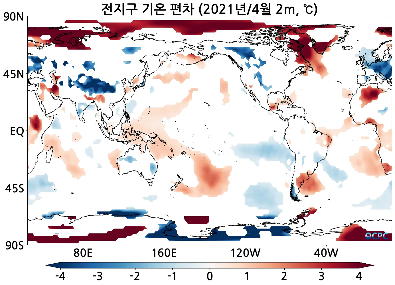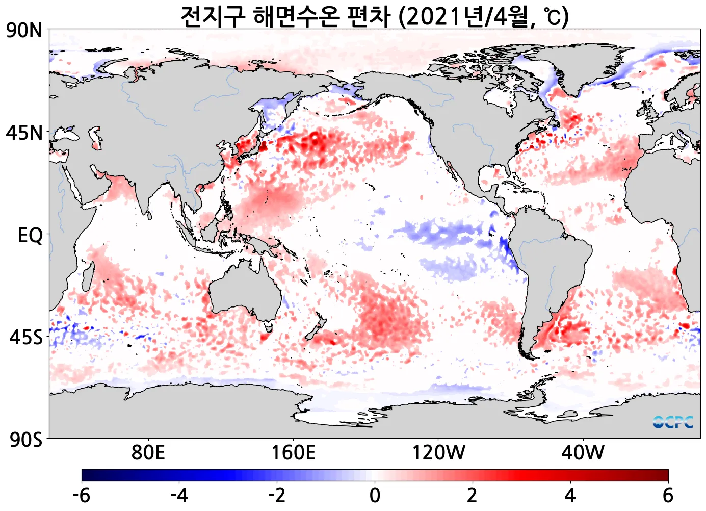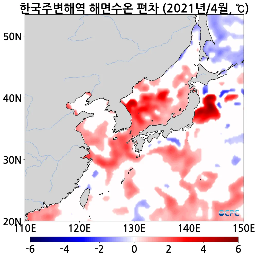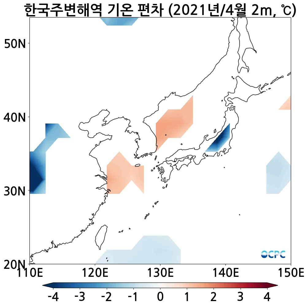 최근 30년 동안 4월 전지구 평균 해상기온은 10년마다 약 0.2 °C씩 증가하는 추세이나, 한국주변해역은 10년마다 약 0.1 °C씩 감소하는 추세입니다.