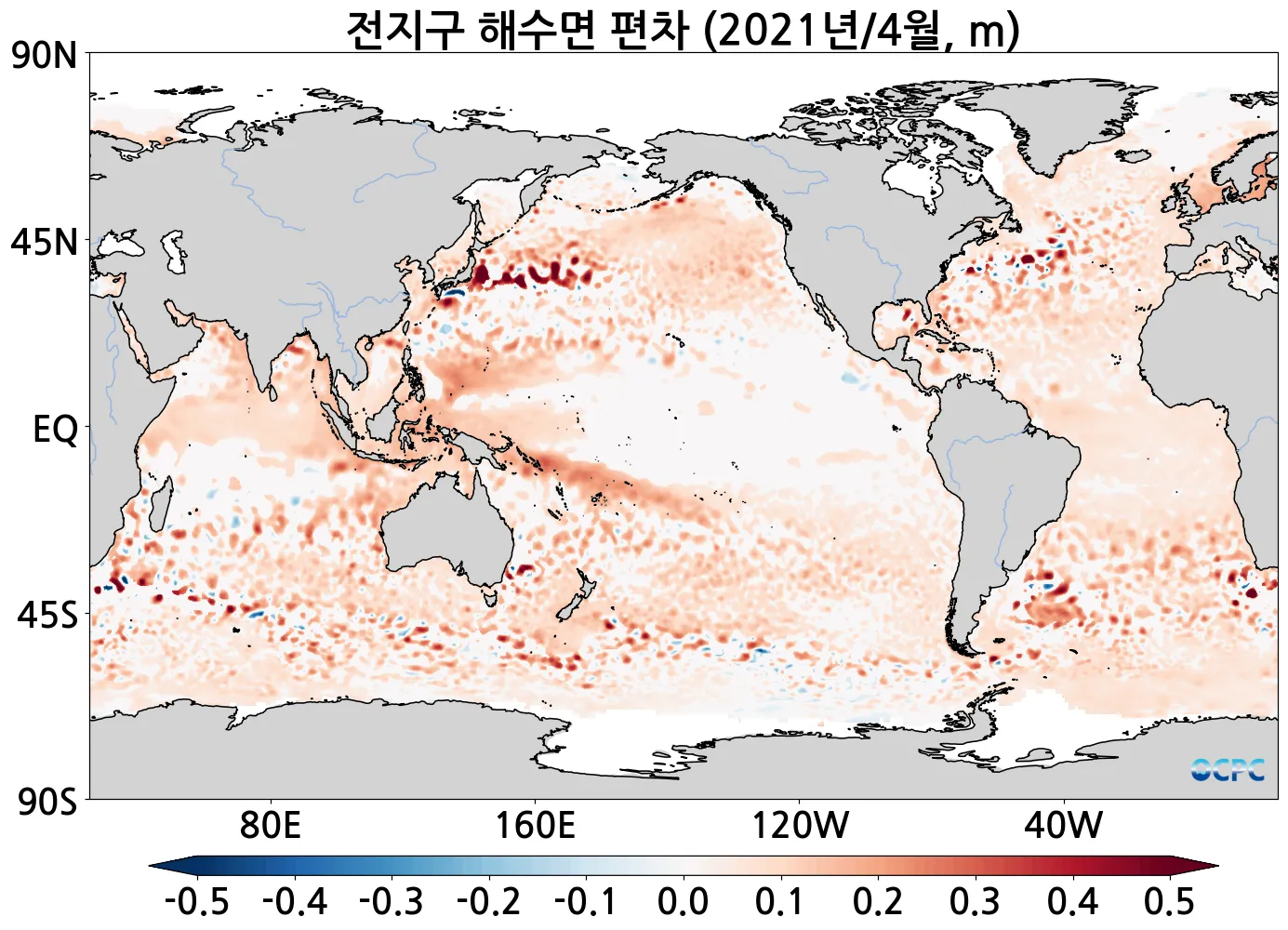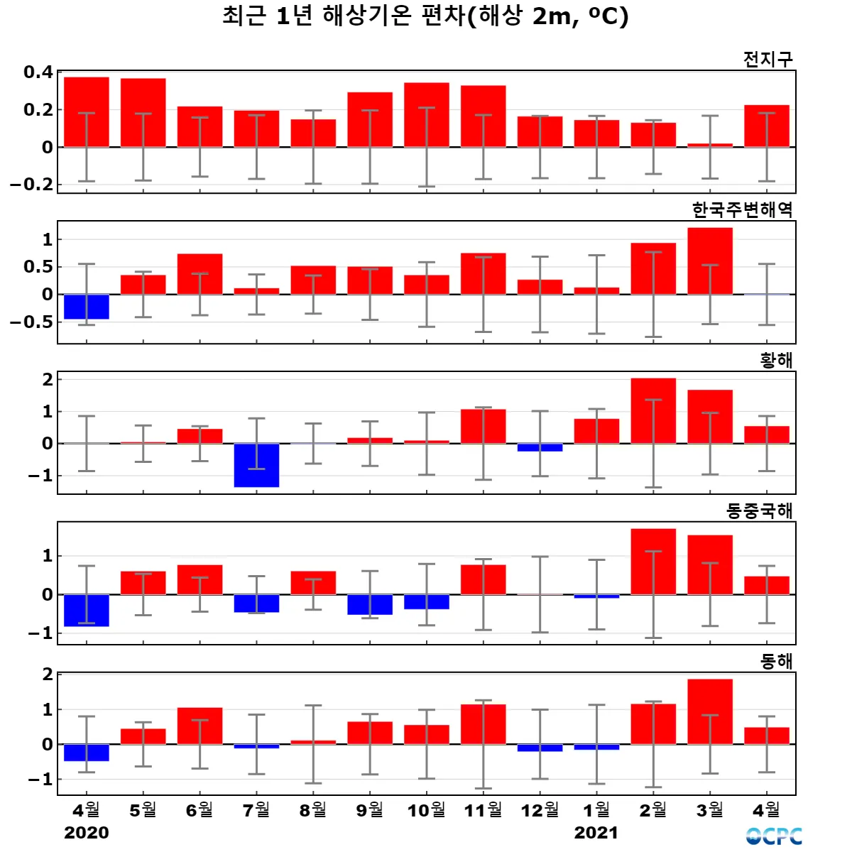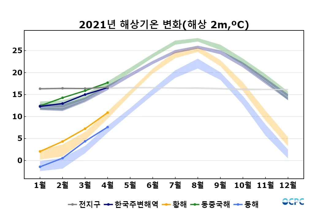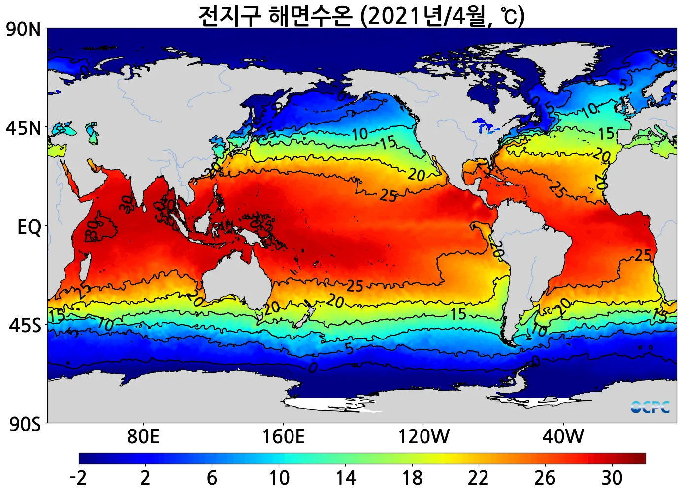 최근 30년 동안 4월 전지구 평균 해상기온은 10년마다 약 0.2 °C씩 증가하는 추세이나, 한국주변해역은 10년마다 약 0.1 °C씩 감소하는 추세입니다.
