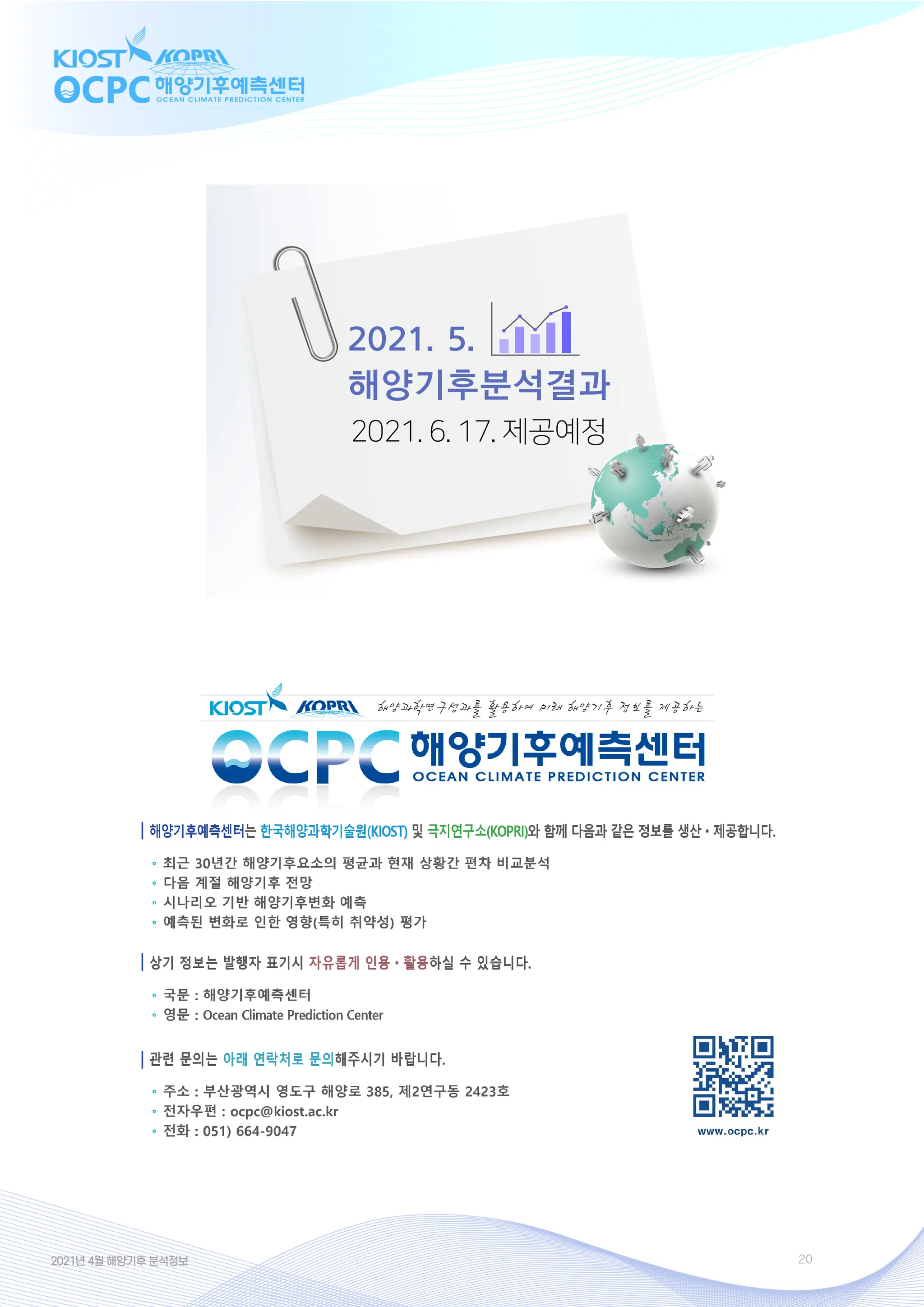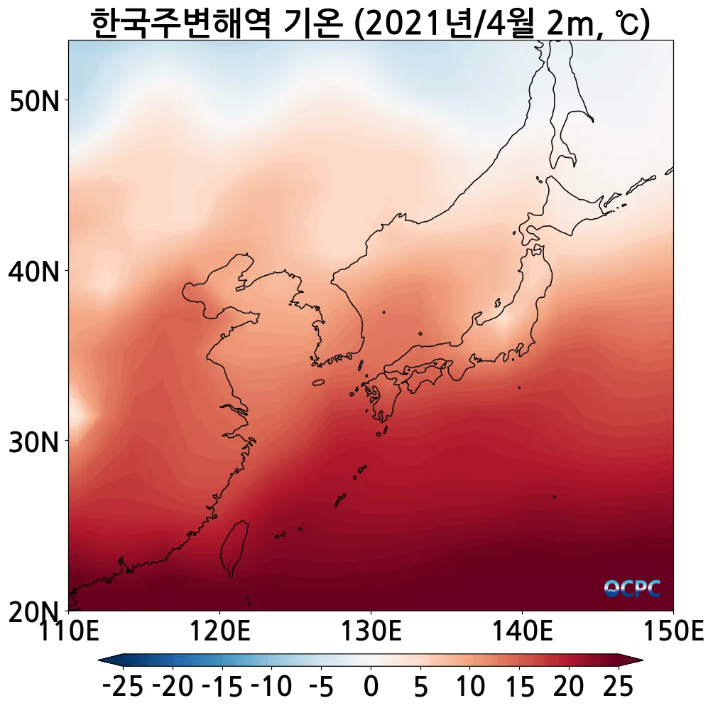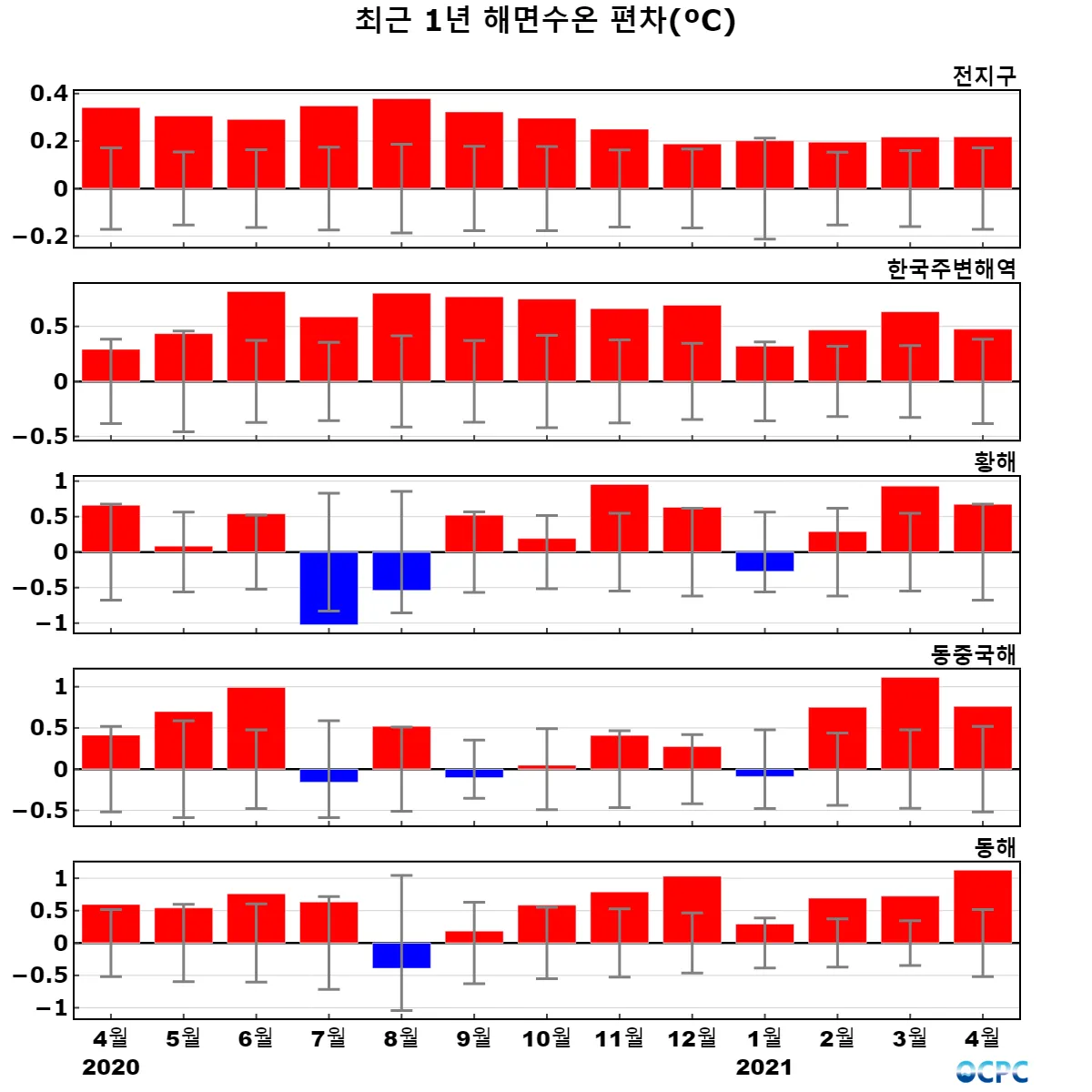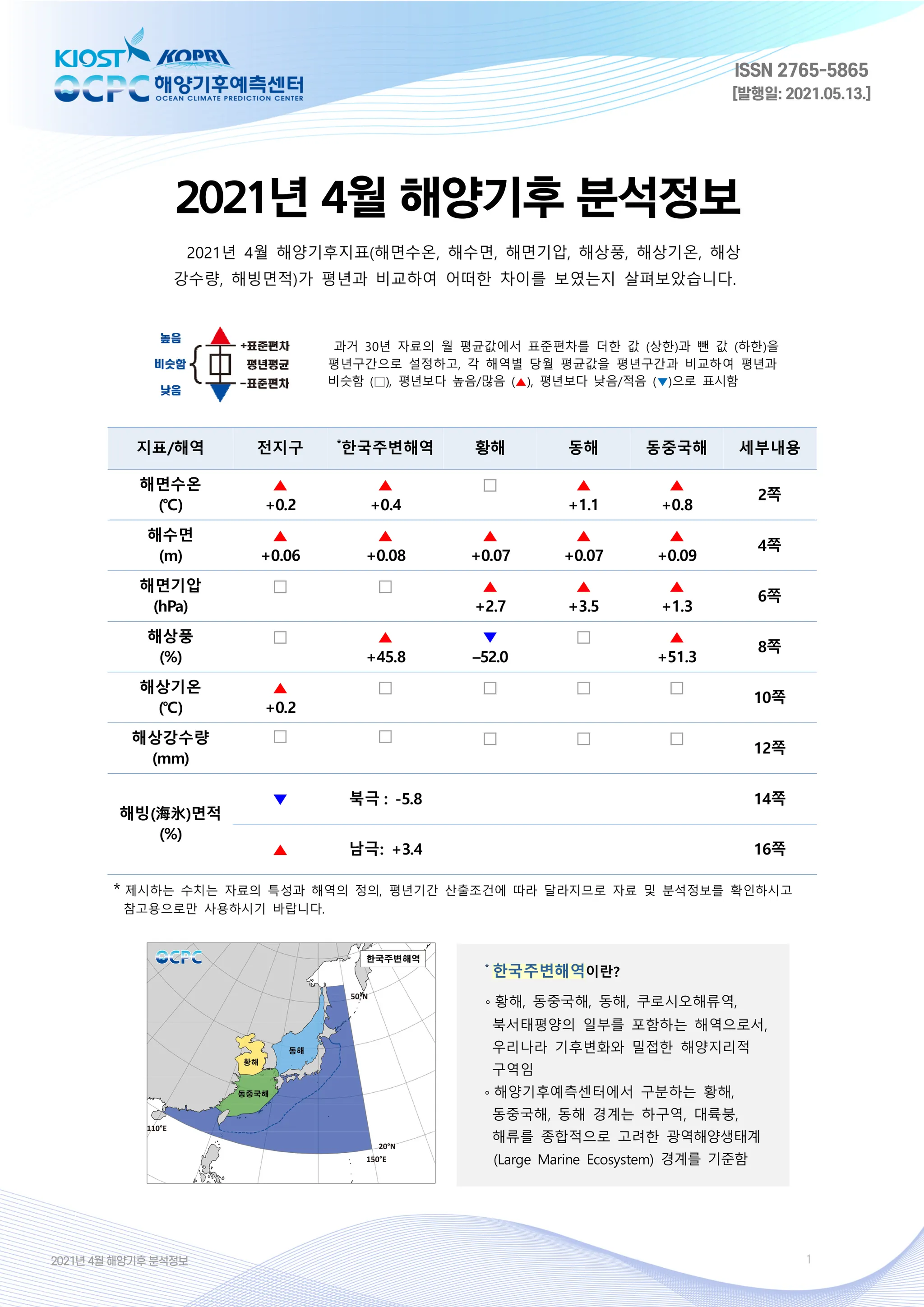 최근 30년 동안 4월 전지구 평균 해상기온은 10년마다 약 0.2 °C씩 증가하는 추세이나, 한국주변해역은 10년마다 약 0.1 °C씩 감소하는 추세입니다.