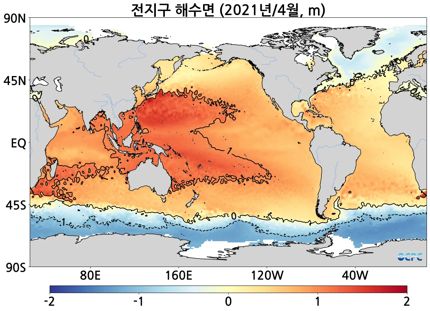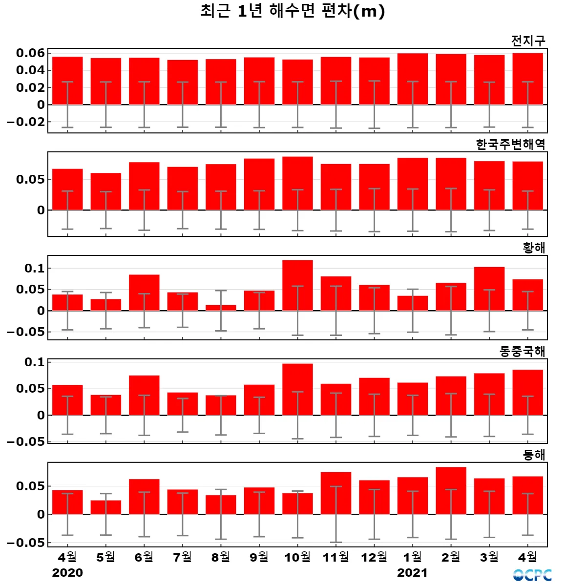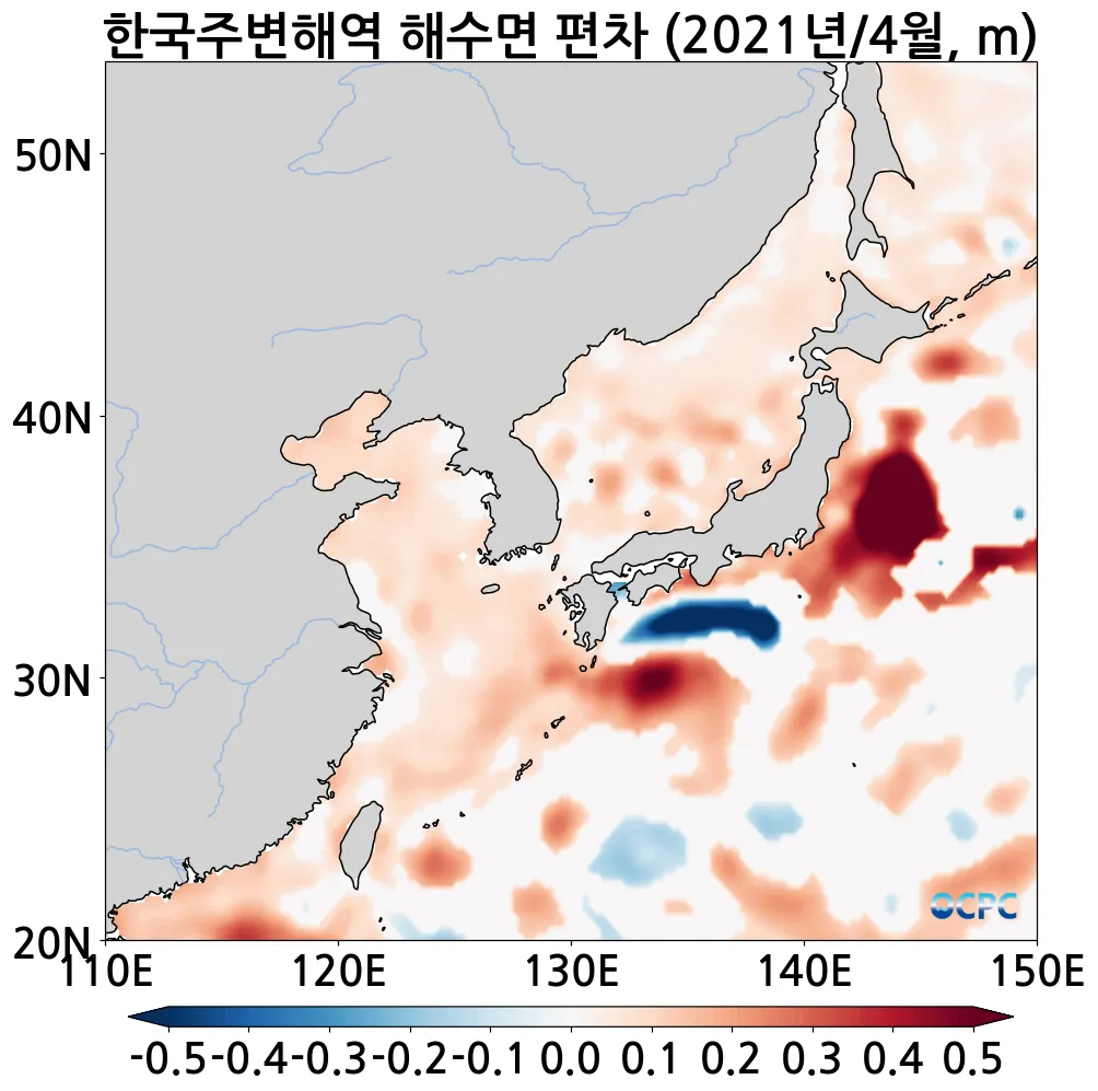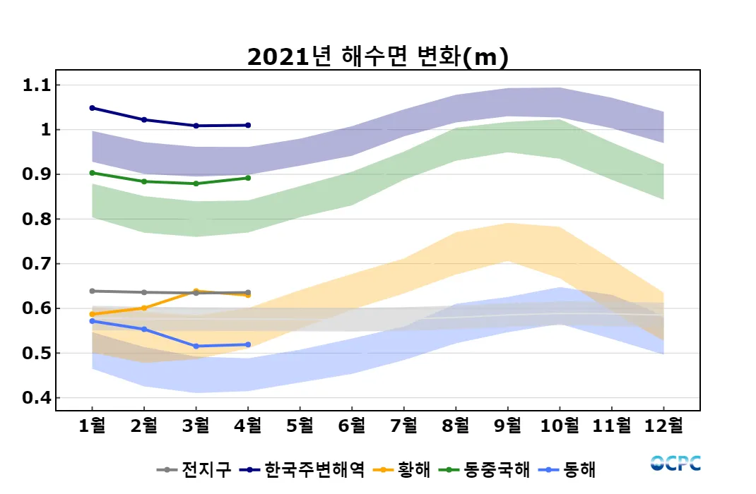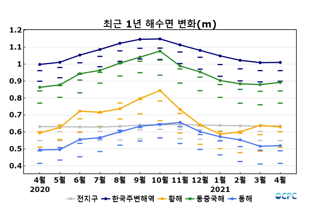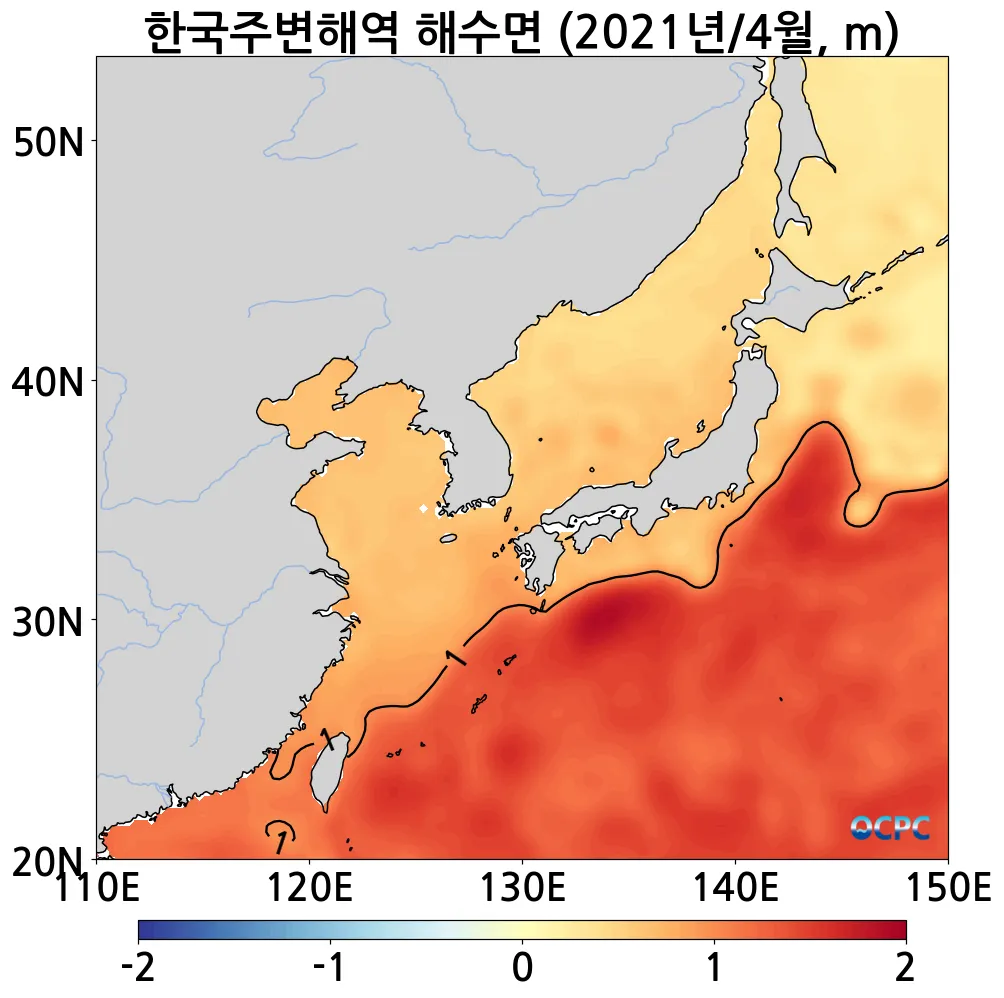 최근 28년 동안 4월의 해수면은 모든 해역에서 지속적으로 상승하는 추세이며, 해수면 상승률은 10년마다 전지구 3.3 cm, 동해 3.2 cm, 동중국해 3.3 cm, 황해 3.7 cm로 황해의 상승률이 가장 높았습니다.