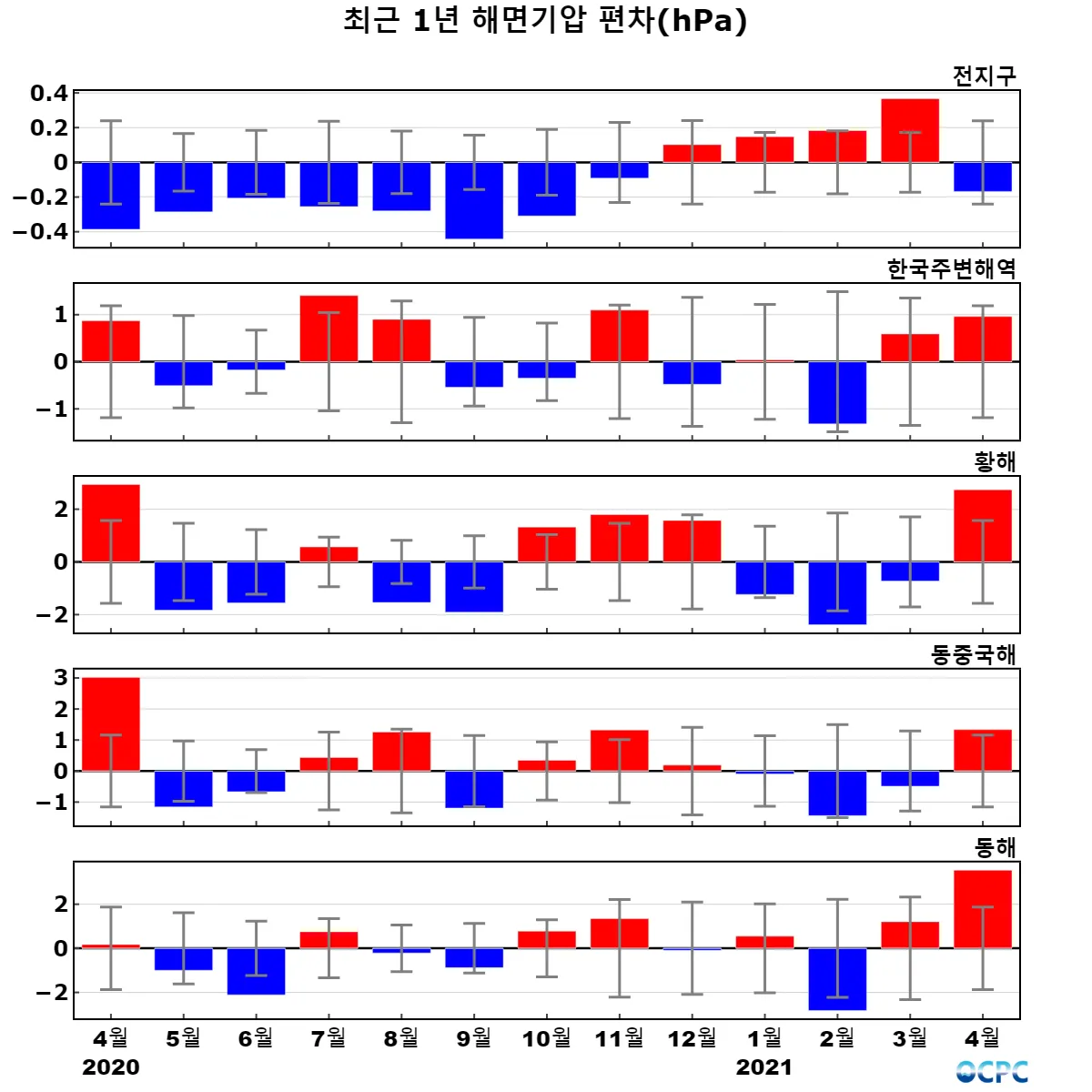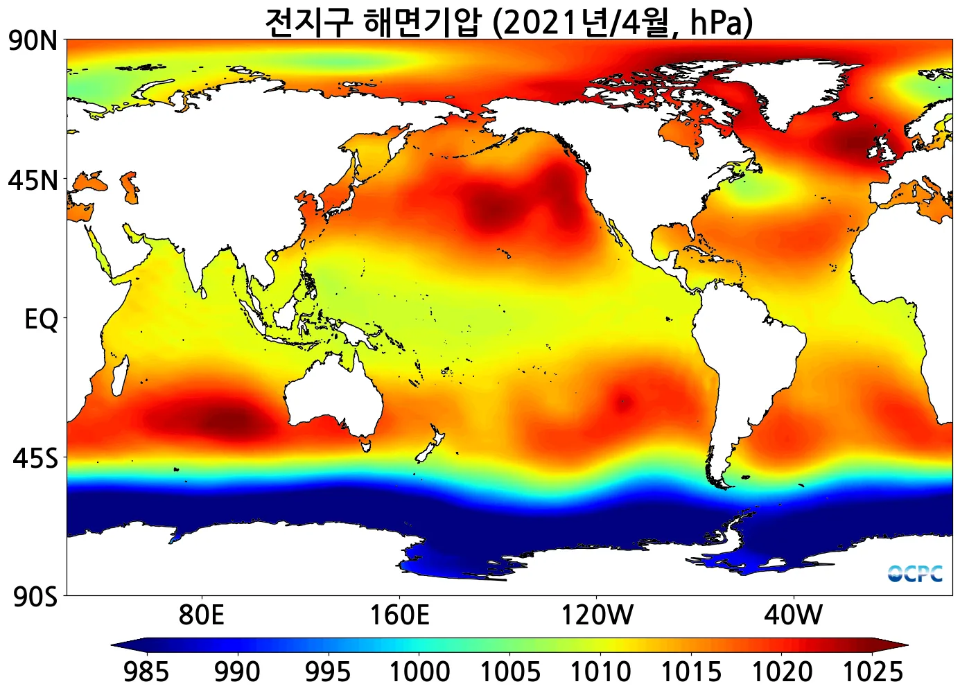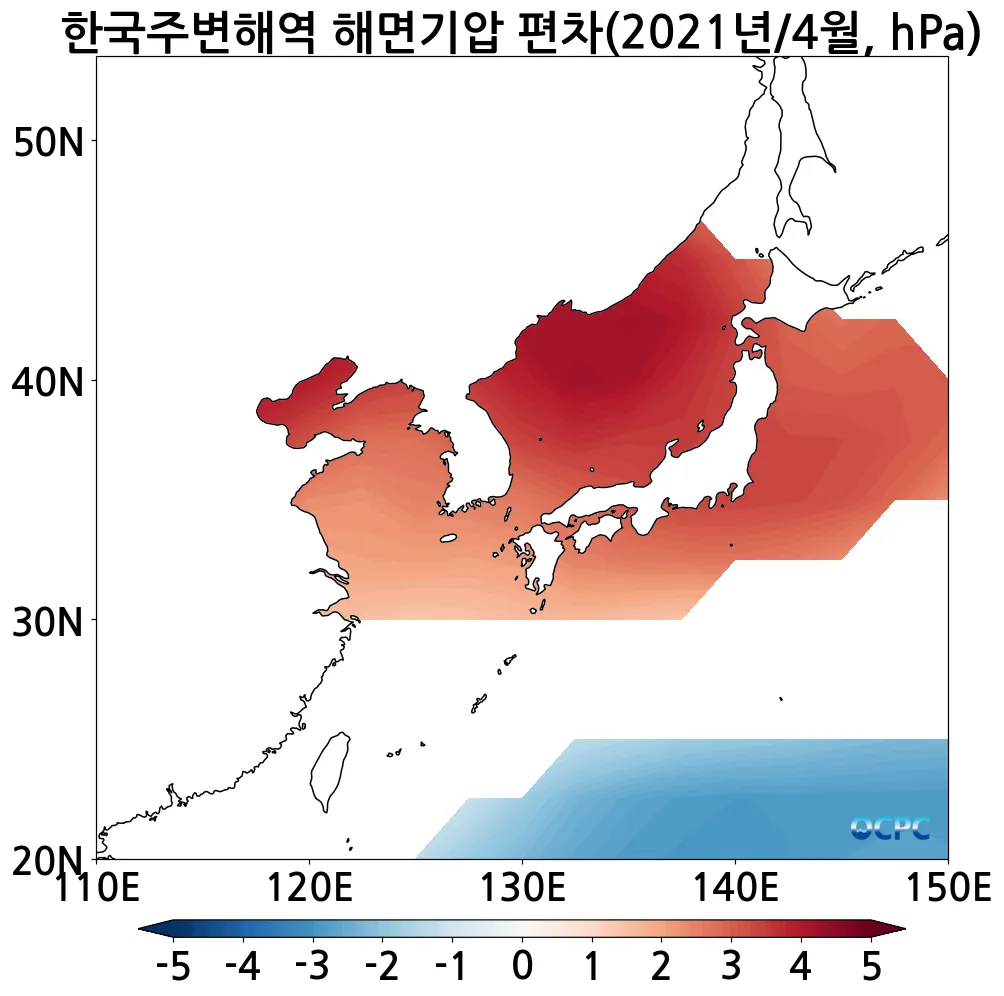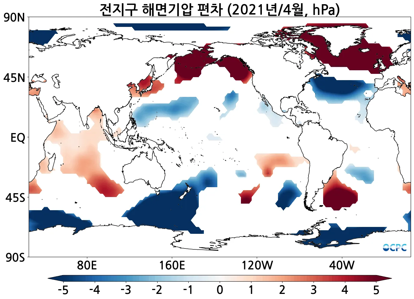 제2호 태풍 수리개(Surigae)의 영향으로 북서태평양 아열대 해역의 해면기압이 평년보다 낮았습니다.