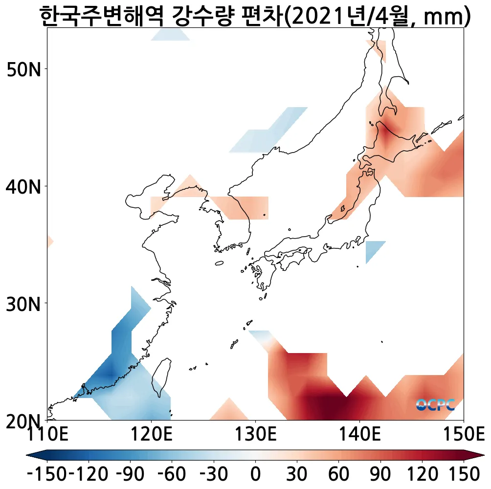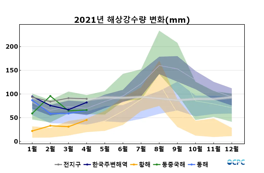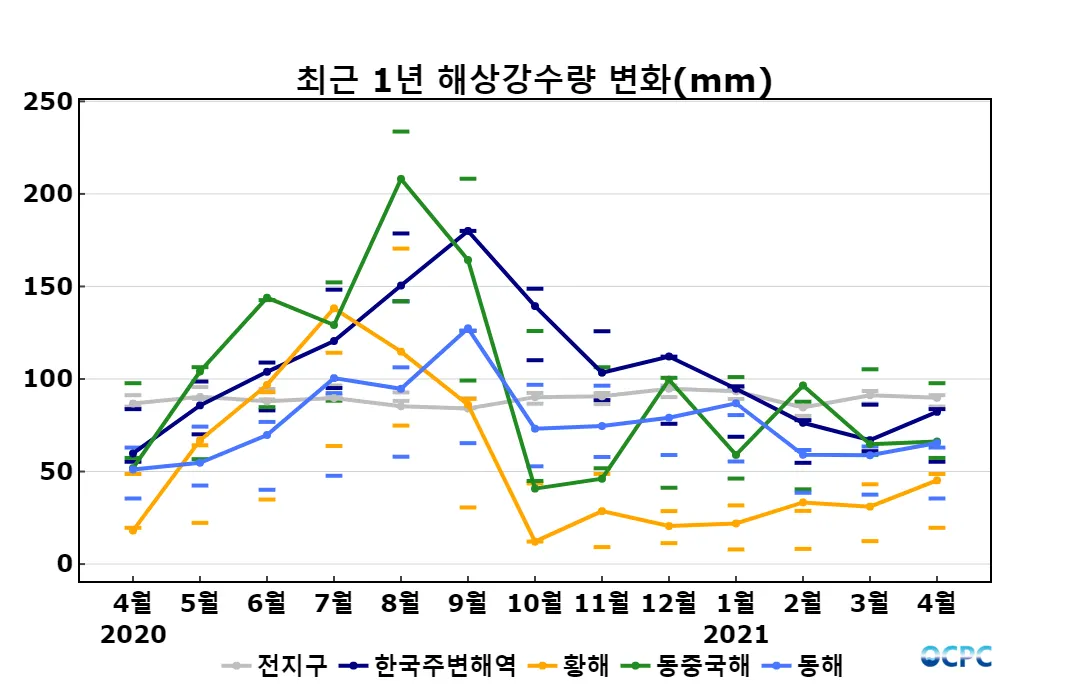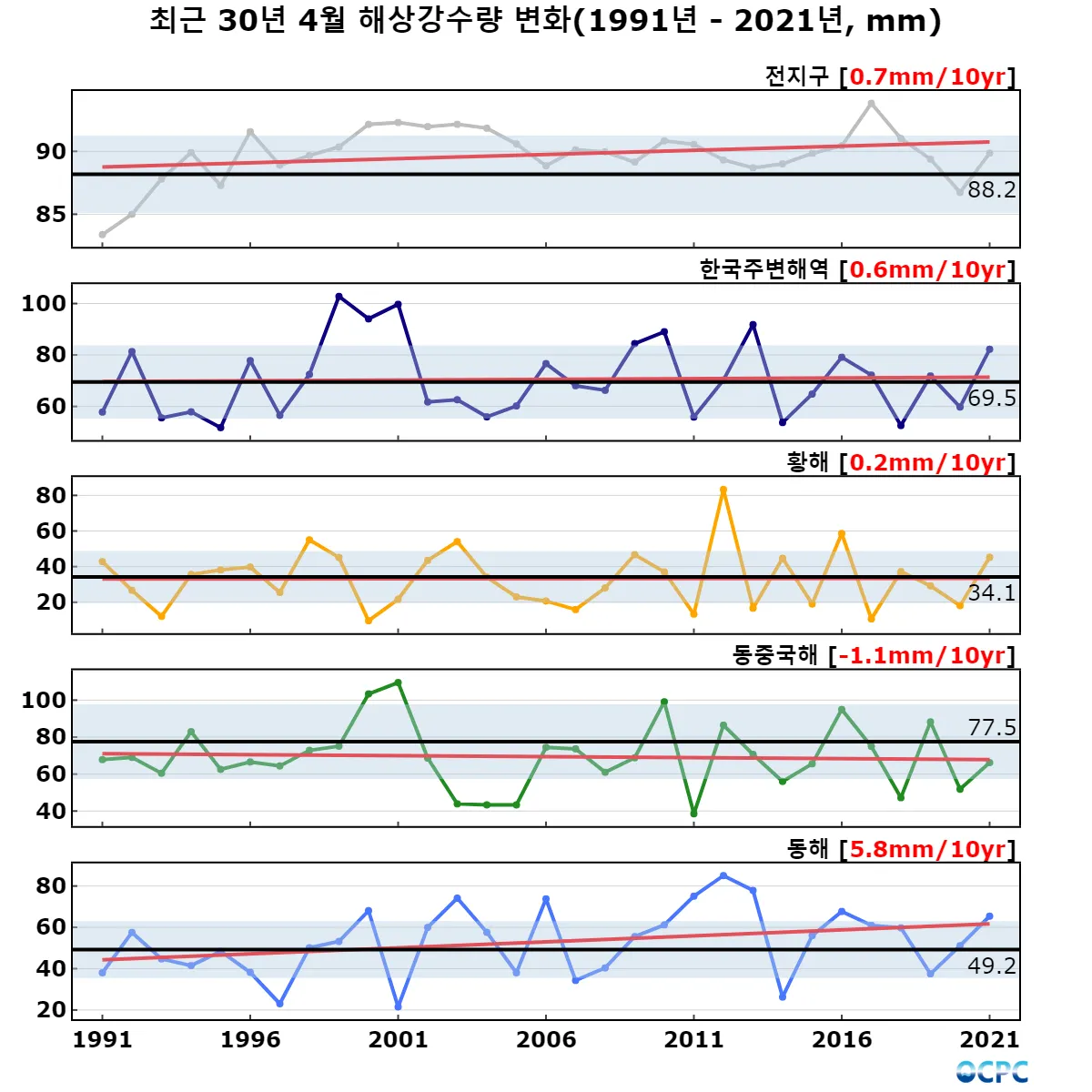 최근 30년 동안 4월 누적 해상강수량은 전지구 해역의 경우 10년마다 약 0.7 mm씩 증가하는 추세이며, 동중국해는 약 1.1 mm씩 감소하고, 동해는 약 5.8 mm씩 증가하는 추세입니다.