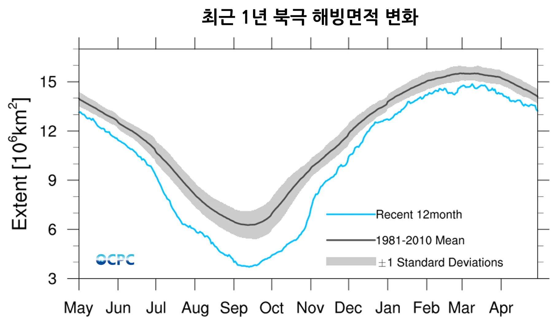 이는 최소 면적을 기록한 2019년 4월보다는 41만 km² 늘어난 값이며, 위성관측 기간 중 6번째로 작은 값입니다.