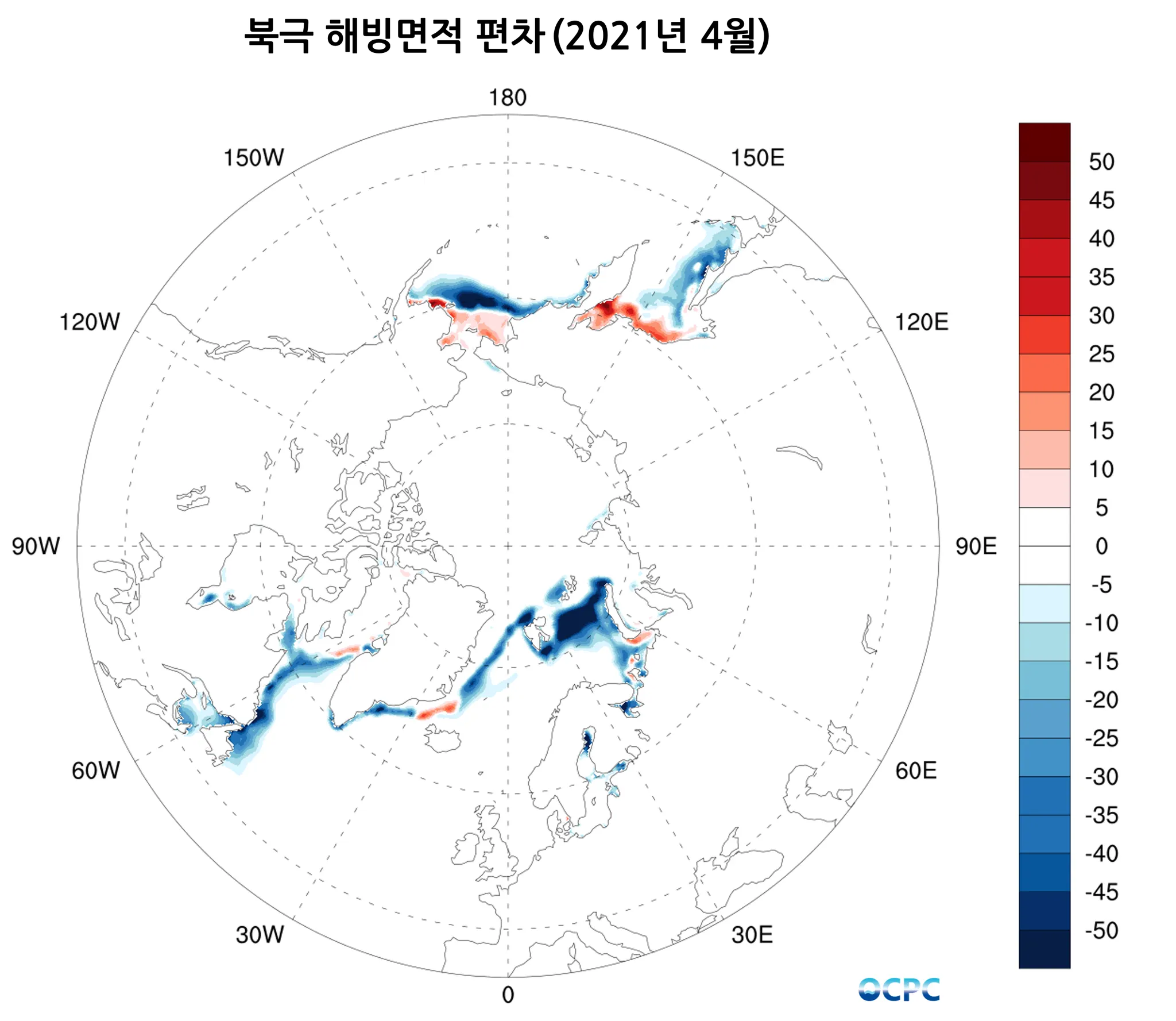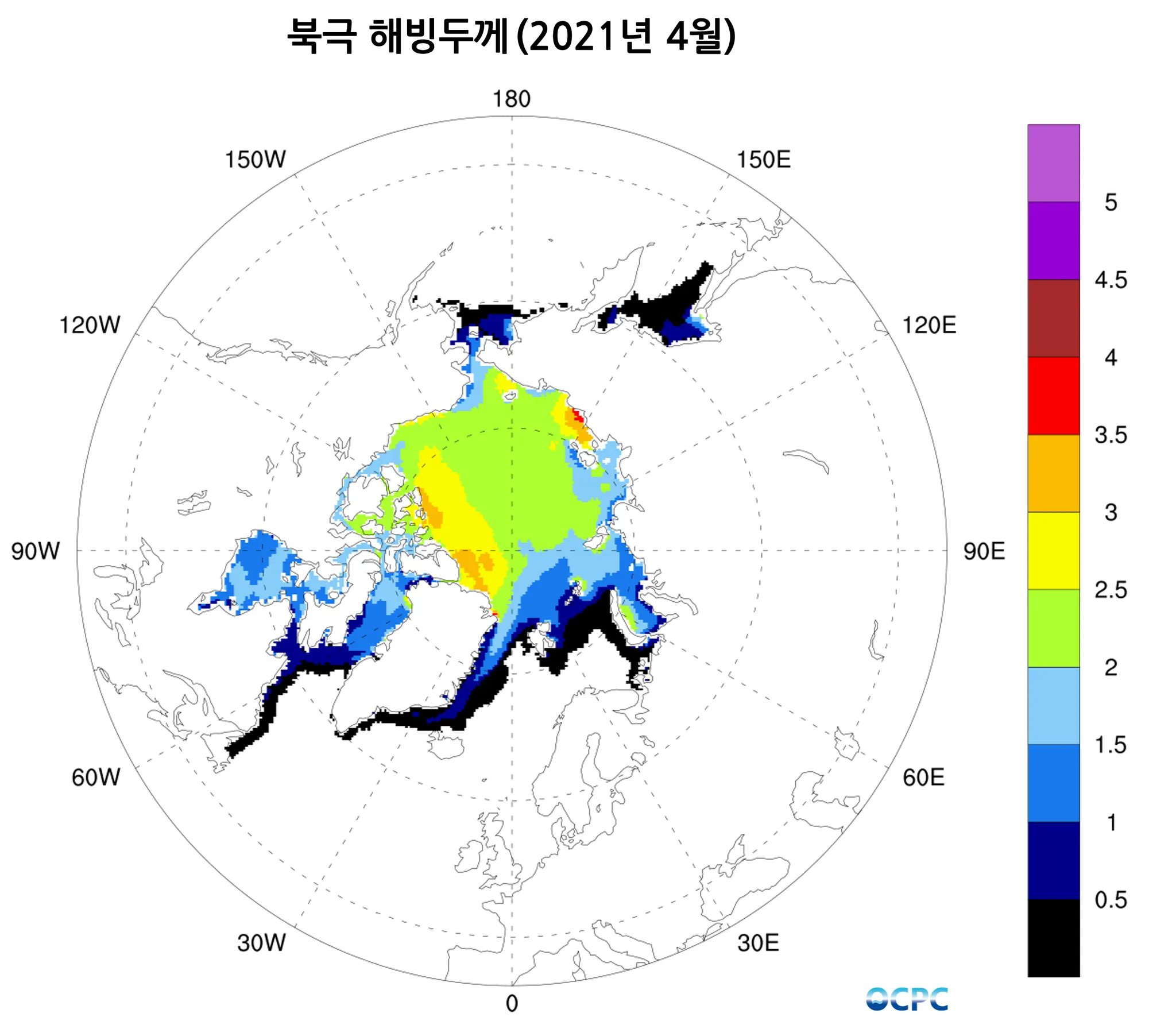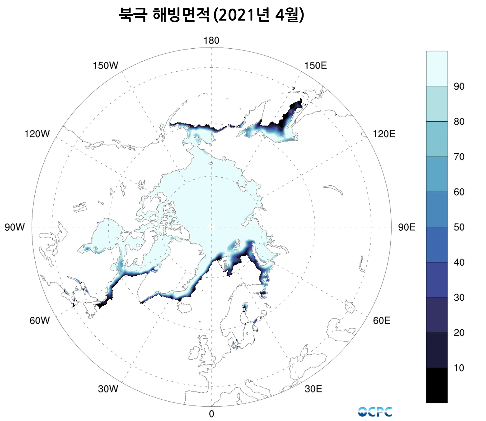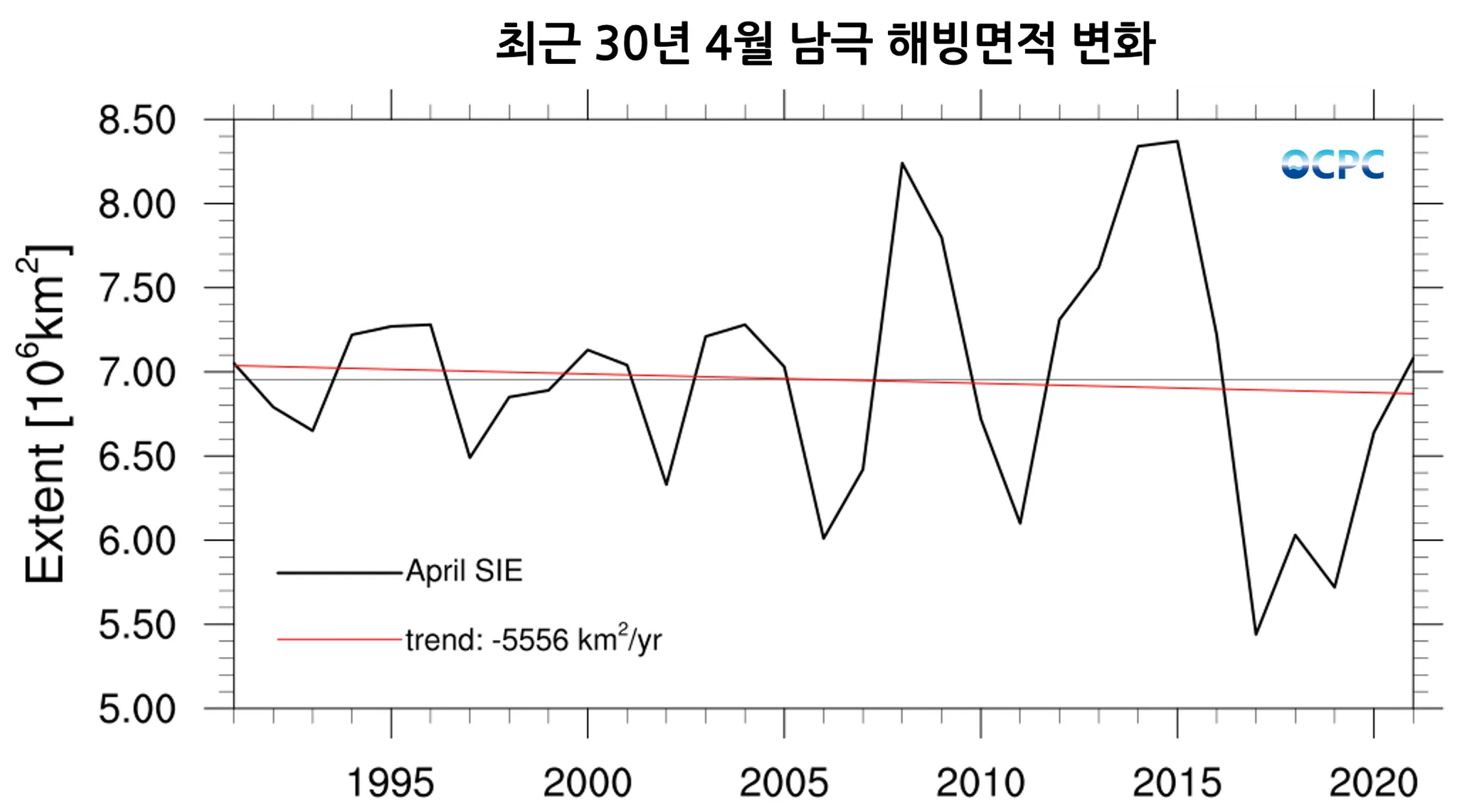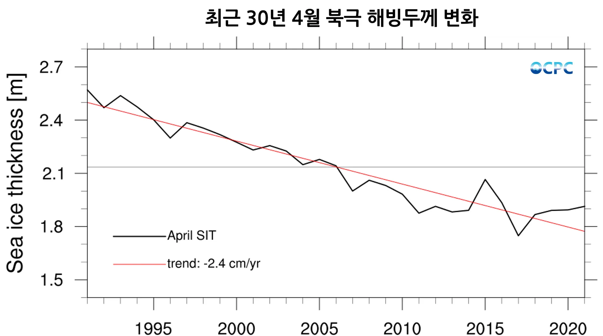 최근 30년 동안 4월 북극 해빙 면적은 10년마다 39만 km²만큼 사라졌습니다.