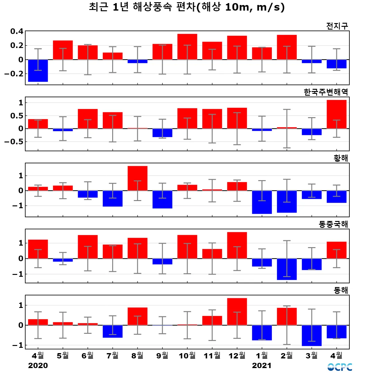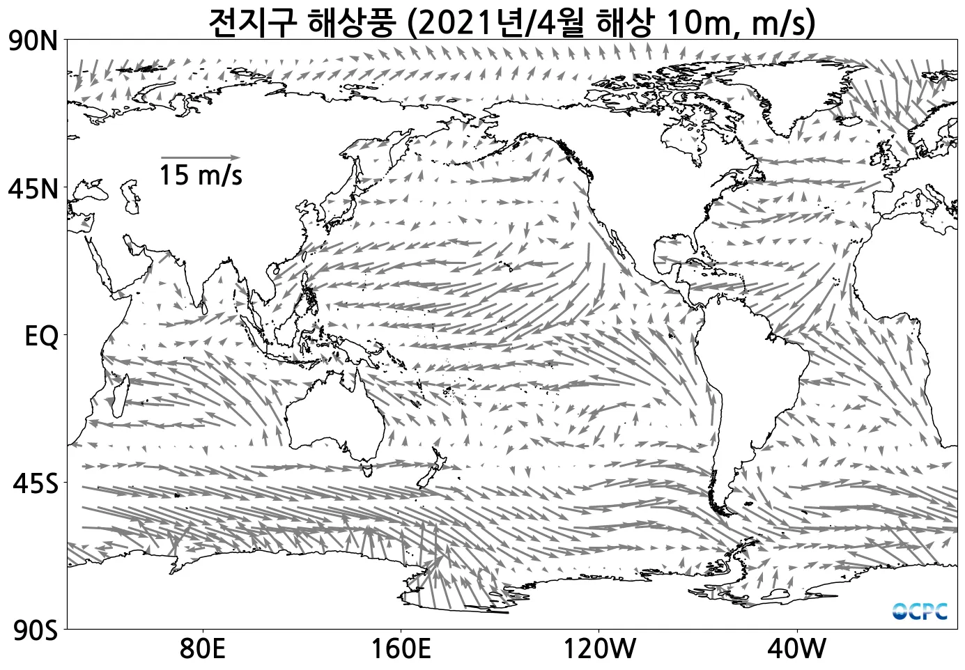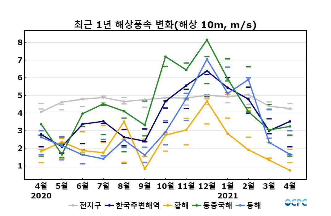 전지구 평균 해상풍의 세기는 평년과 비슷했으나, 한국주변해역 해상풍은 평년보다 45.8 % 증가하여 최근 30년 중 가장 강했습니다.